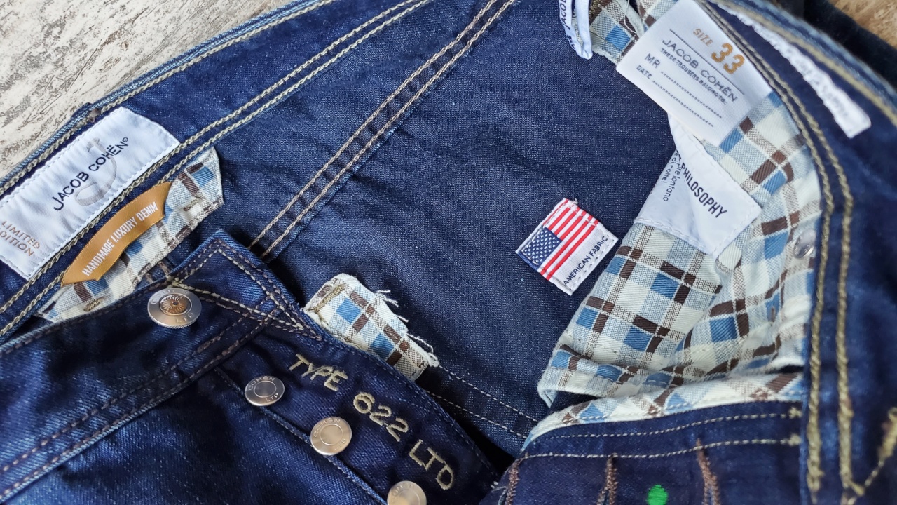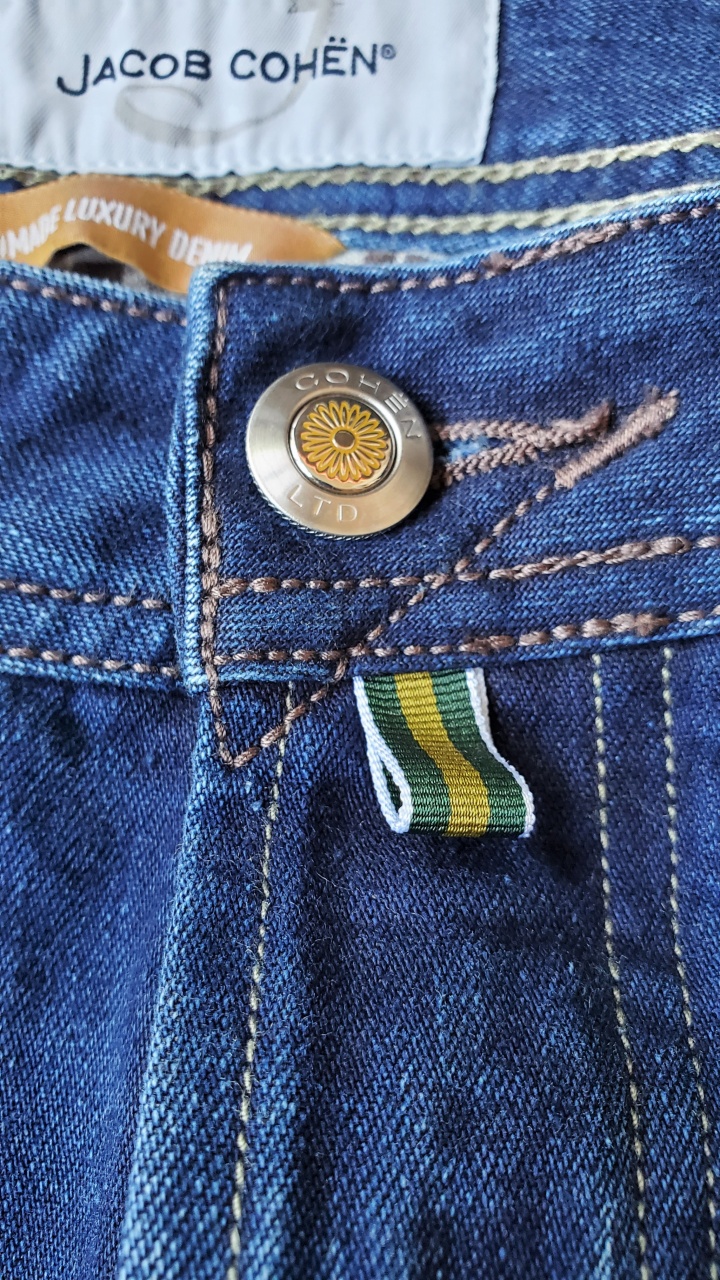 Сзади на правом бедре джинсы имеют фирменный ярлык из меха пони коричневого цвета с логотипом марки Jасоb Соhеn, выполненный из металла, что указывает на принадлежность к "лимитированной" линейке марки и порядковый номер - 001