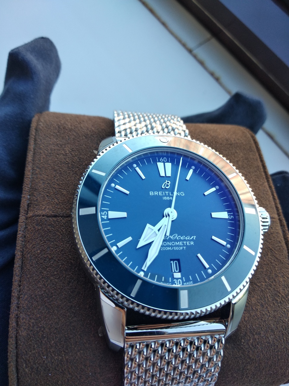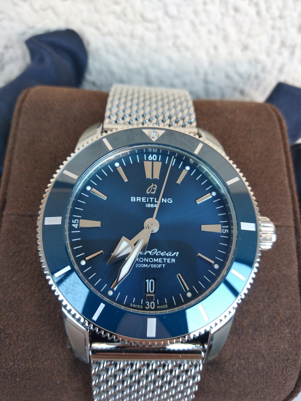 В продаже Breitling SOH B20 в оптимальном размере 44 мм, самая красивая и самая удачная комбинация - синий циферблат и миланский браслет. На руке смотрятся ярко и броско - настоящий Брайтлинг.