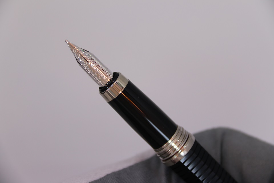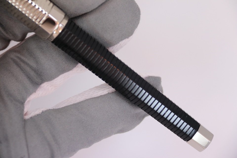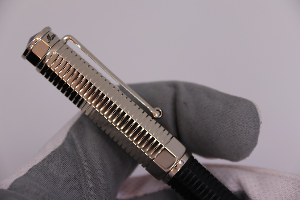 Перьевая ручка Монтеграппа NeroUno Duetto Palladium, выполненная в неповторимом восьмигранном дизайне серии Nero Uno Linea, украшенном горизонтальными кольцевыми линиями, приобрела новую отличительную особенность: колпачок полностью выполнен из металла и покрыт драгоценным палладием. Корпус пишущего инструмента по-прежнему сделан в строгом черном цвете из драгоценной смолы.