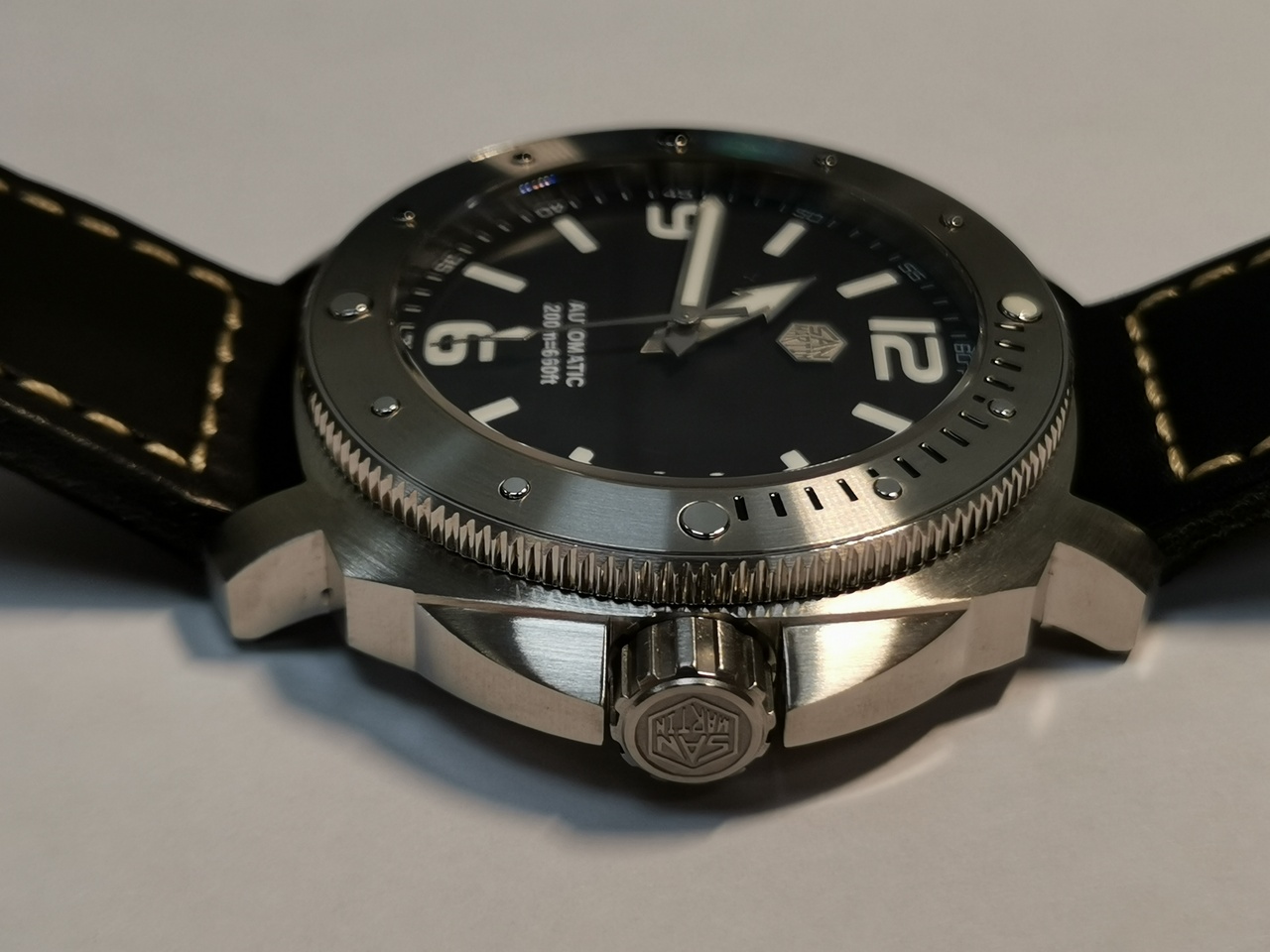 Циферблат матовый, цвета черного кофе, без градиента. Часовые метки выполнены люминофорной краской в виде удлинненых полос. Метки на 12, 3,6, 9 часов выполнены крупным техническим рубленым шрифтом. Минутная шкала тонко выполнена белой краской, не доминирует. Надписи Automatic, 200m=660ft, также выполнены белой краской. Брендовый логотип в виде серебристого шестиугольника на матовом поле, которого, вписаны полированные буквы составляющие надпись San Martin, значительно улучшает поле циферблата. На читабельность не влияет.