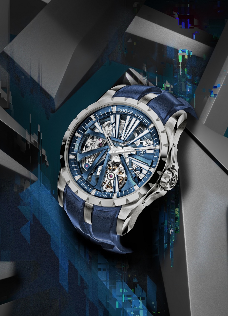 Скелетонизированный циферблат часов представляет собой труднообъяснимую композицию из римских чисел и «ломаных» структурных элементов синего цвета, под которыми расположился мануфактурный механизм RD107 (диаметр — 36.9 мм, высота — 10 мм, 558 деталей, 54 камня, частота баланса — 21’600 пк/ч, запас хода — 60 ч) с системой автоподзавода на основе двух микро-роторов.