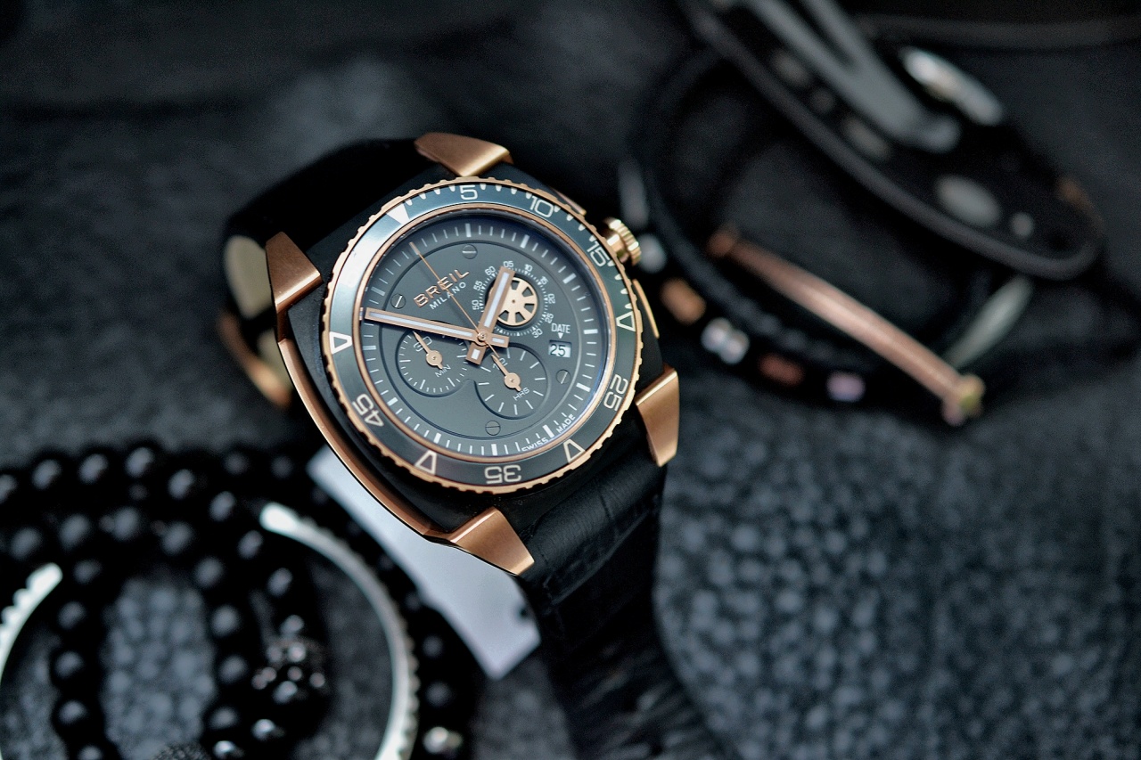 Корпус часов необычной формы- выполнен из ювелирной стали, довольно большого размера. Визуально корпус состоит из нескольких частей - Верхняя часть покрыта черным PVD, нижняя часть и боковины бронзовым.