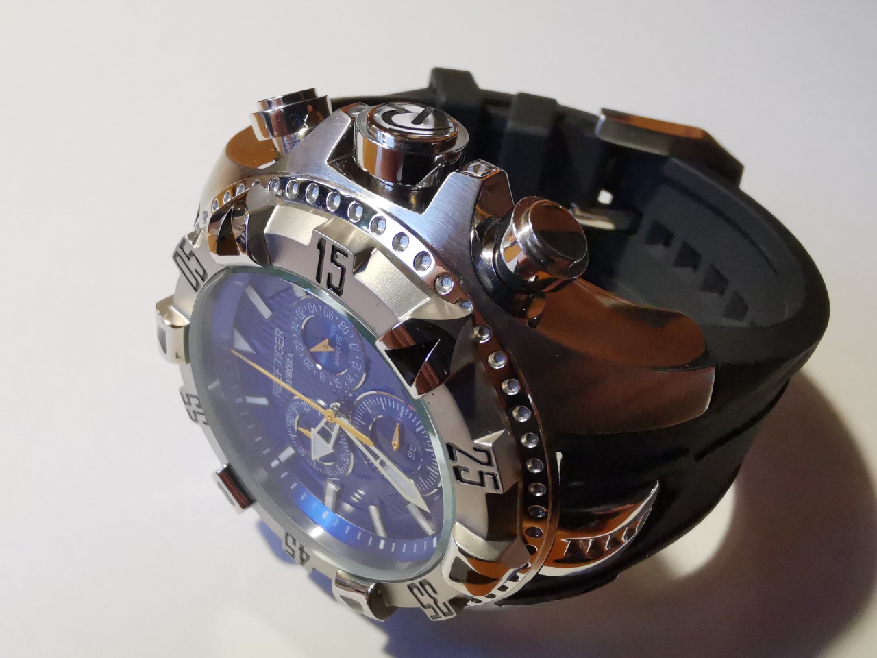 Корпус часов из нержавеющей стали довольно неплохо обработан, без задиров металла и острых кромок. Все части корпуса полированы, кроме верхней части,- она средне сатинирована по периметру. Задняя крышка на резьбе , полирована, имеет гравированные надписи: reef tiger, hercules, st.steel, chronograph, rga303, wr20atm. Последнее неправда, - продавец на мой вопрос о водозащите ответил, что она всего 5 бар. Это и понятно, так как кнопки хронографа крупные, довольно подвижные, и при этом не фиксируются на резьбе. На резьбе только основная "заводная" головка, - она крупная и ей довольно сложно выставить дату, постоянно промахиваюсь мимо нужного положения. Впрочем, стрелки переводятся вполне удовлетворительно в максимально выдвинутом положении головки. Кнопки хронографа тоже работают и даже без нареканий. Вот только смущает их подвижность, не дай бог задеть за что-то твердое, наверняка погнутся или выскочат. Подвижность кнопок в пределах 0,5мм от их оси. Кнопки полированы, имеют четкие границы, но не острые. Безель часов на 120 щелчков, довольно подвижный, имеет заметный люфт вперед-назад в пределах одного деления. Относительно плоскости корпуса покачиваний нет. Поверхность безеля химически матирована, выступающие части соответствующие часовым меткам полированы и отмечены треугольниками заполненными черной краской. На безеле есть минутные отметки: 05,15,25,35,45,55 минут, также заполнены черной краской. По ощущениям, безель может быть изготовлен не из стали, теплопроводность безеля и корпуса мне показались разными. Стекло установленное над циферблатом довольно толстое и широкое, целых 36мм в диаметре. Производитель заявляет сапфир, но это неправда, - стекло минеральное(проверено тестером). Циферблат часов пластиковый, штампованный, светло-синего цвета, с текстурой стиральной доски. Имеет накладные часовые метки, поблескивающие хромом, и заполненные люмом. Люм слабенький, слабже чем у Пагани, и быстро выдыхается. Стрелки крупные, плоские, хромированные, острые концы которых также заполнены люмом, того же качества, что и метки. Секундная стрелка, как и стрелки малых циферблатов, покрашены желтой краской. Из малых циферблатов, один считает минуты, второй секунды, и третий показывает время в 24 часовом формате. Есть окошко даты, просто прямоугольное без декора. Дата начинает сменятся за час до полуночи.
