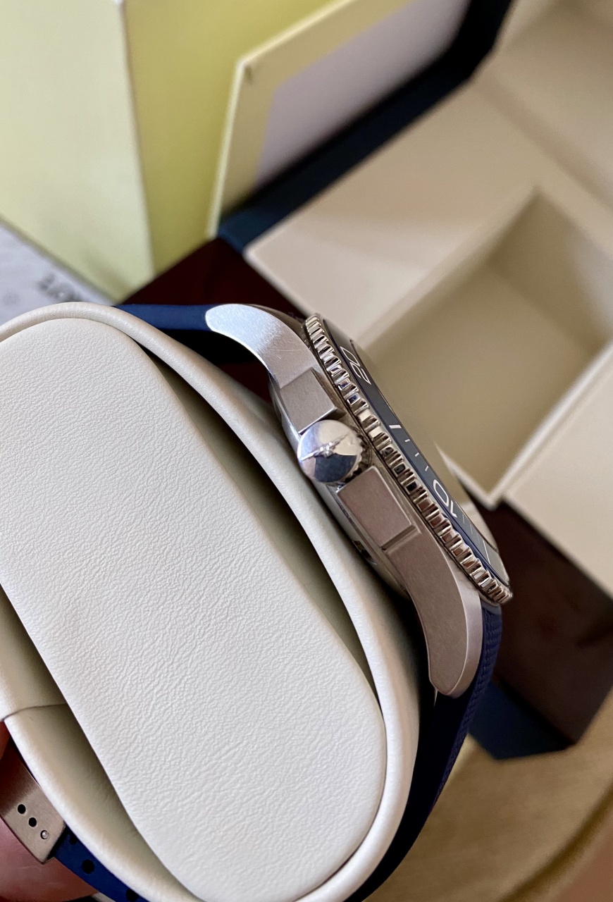 Керамический синий безель, калибр L888 с кремниевой пружиной, запас хода 64 часа.