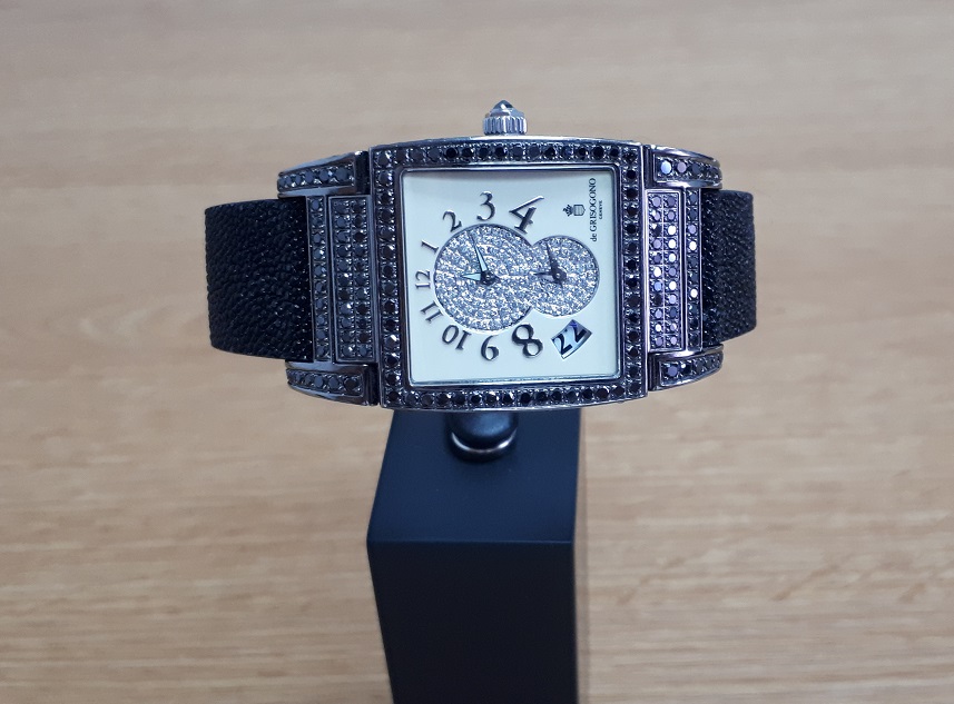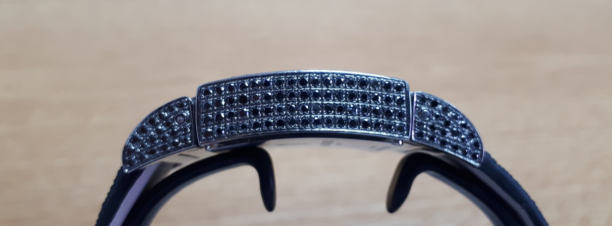 Часы и застежка дополнительно инкрустированы черными и белыми бриллиантами.