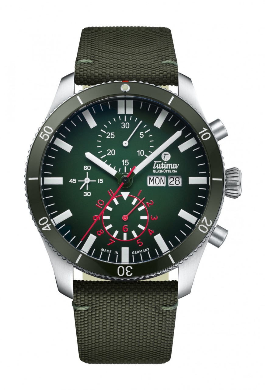 Новая пилотская модель Grand Fleiger Airport (Ref. 6406-03) от немецкой часовой компании Tutima имеет круглый матовый корпус, изготовленный из нержавеющей стали, диаметром 43,0 мм, водонепроницаемый до 200 метров. На торце завинчивающейся рифленой заводной головки, расположенной на 3 часах, выгравировано изображение логотипа бренда Tutima. Пушеры хронографа расположены на 2 и 4 часах. Вращающийся керамический безель. Задняя крышка часового корпуса глухая завинчивающаяся гравированная. Сапфировое стекло с антибликовым покрытием защищает зеленый циферблат с прямоугольными часовыми маркерами, покрытыми, как и часовая и минутная стрелки, люминесцентным составом SuperLumiNova белого цвета.