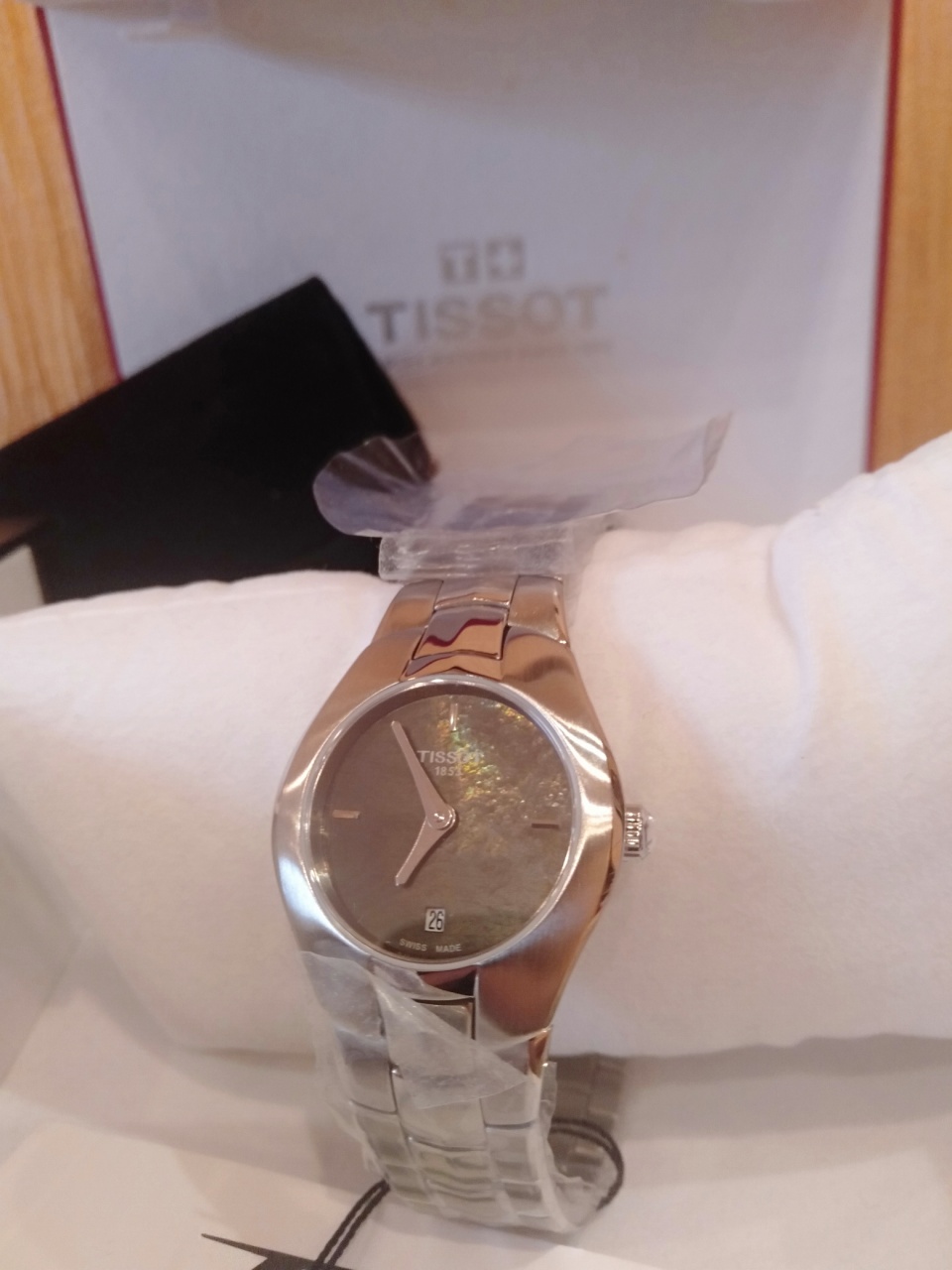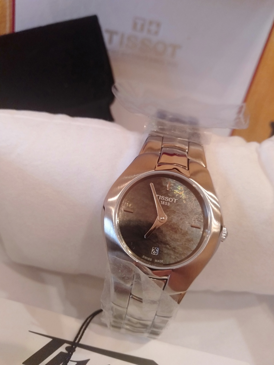 Восхитительный перламутровый циферблат черного цвета, меняющий цвет в зависимости от угла обзора, сапфировое стекло, создающее эффект "без стекла", металлический корпус стального цвета, плавно переходящий в металлический браслет граненого плетения, за счет игры света на гранях также создается эффект изменения цвета.