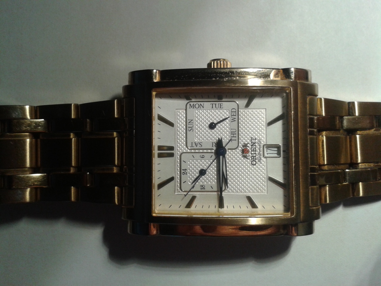 Сегодня получил в наследие от моего дядя, недавно скончавшийся, такие часы - Orient. На крышке написано KL ETAC-A0 CS. Часы почти новые, очень хорошо сохранены. Мой дядя вероятно купил их когда работал в Кувейте в 90-тих годах прошлого века. Не успел наыти год производства этой модели и какая именно моя модель - 001,002 или другая. Думаю что 001 посколько имеет желтое покрытие. Спасибо за информации, которой здесь нашел!!! Моя рука тонкая, браслет для меня болшой, думаю 2 звенка лишние, отдам в мастерскую починят.