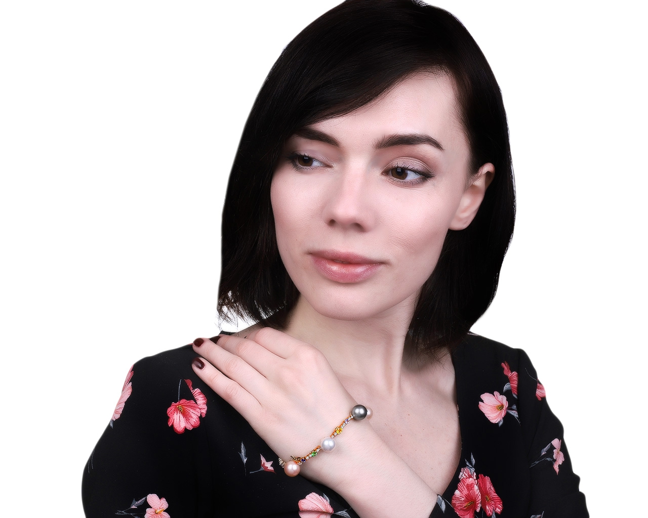 Представляем вашему вниманию оригинальный золотой браслет с жемчугом 10 мм, бриллиантами 1.33ct и голубыми 1.36ct и розовыми 0.76ct сапфирами от всемирно известного бренда Schoeffel.