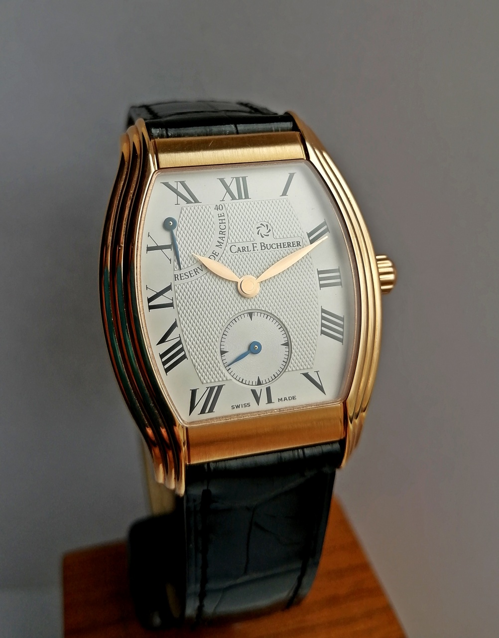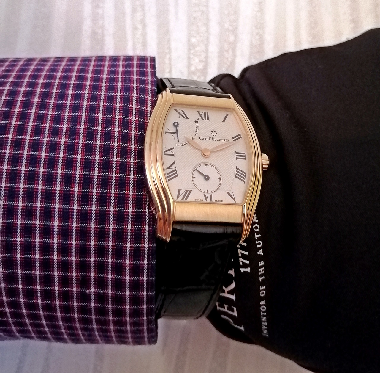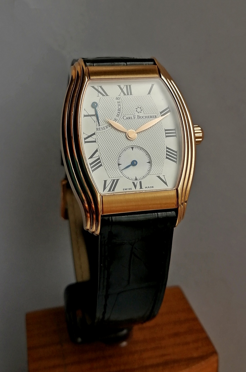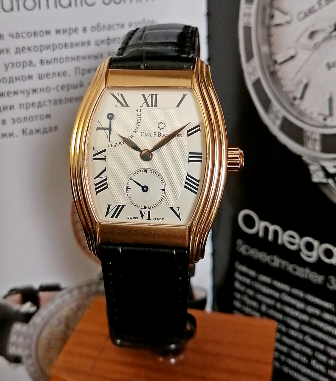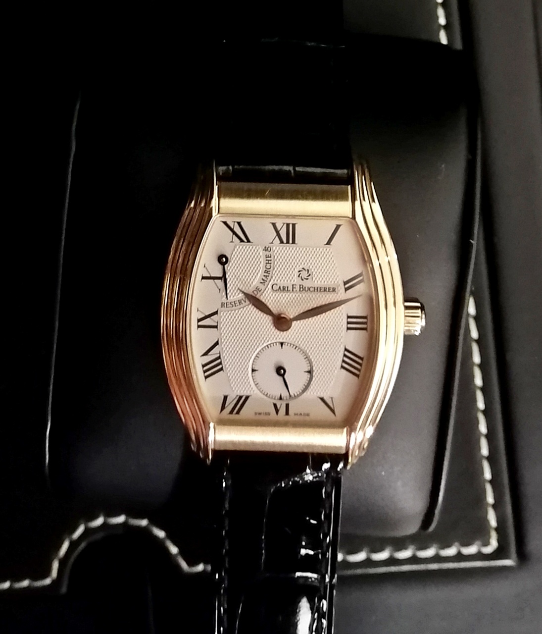 В продаже шикарные часы Carl F. Bucherer ARCHIMEDES в корпусе размером 31*34мм и толщиной всего 8,8мм изготовлен из золота 750ой пробы, ручной завод запас хода 40 часов, внешнее состояние у часов отличное, ни каких забоин и мегацарапин, стекло чистое. Установлен новый родной ремень, старый со следами носки, он в комплекте. На бирке указан только вес часов + застёжка ещё тоже изготовлена из 750 ого золота, итого только 750ого золота в этих часах около 40 гр. Из минусов, стрелка запаса хода стартует ~ с 4х часов (на первом фото видно, это фактически 0 часов показывает запас хода) привыкаешь к этому быстро, вскрывать часы и переставлять стрелку из-за этого думаю не стоит). Пересыл без проблем.
