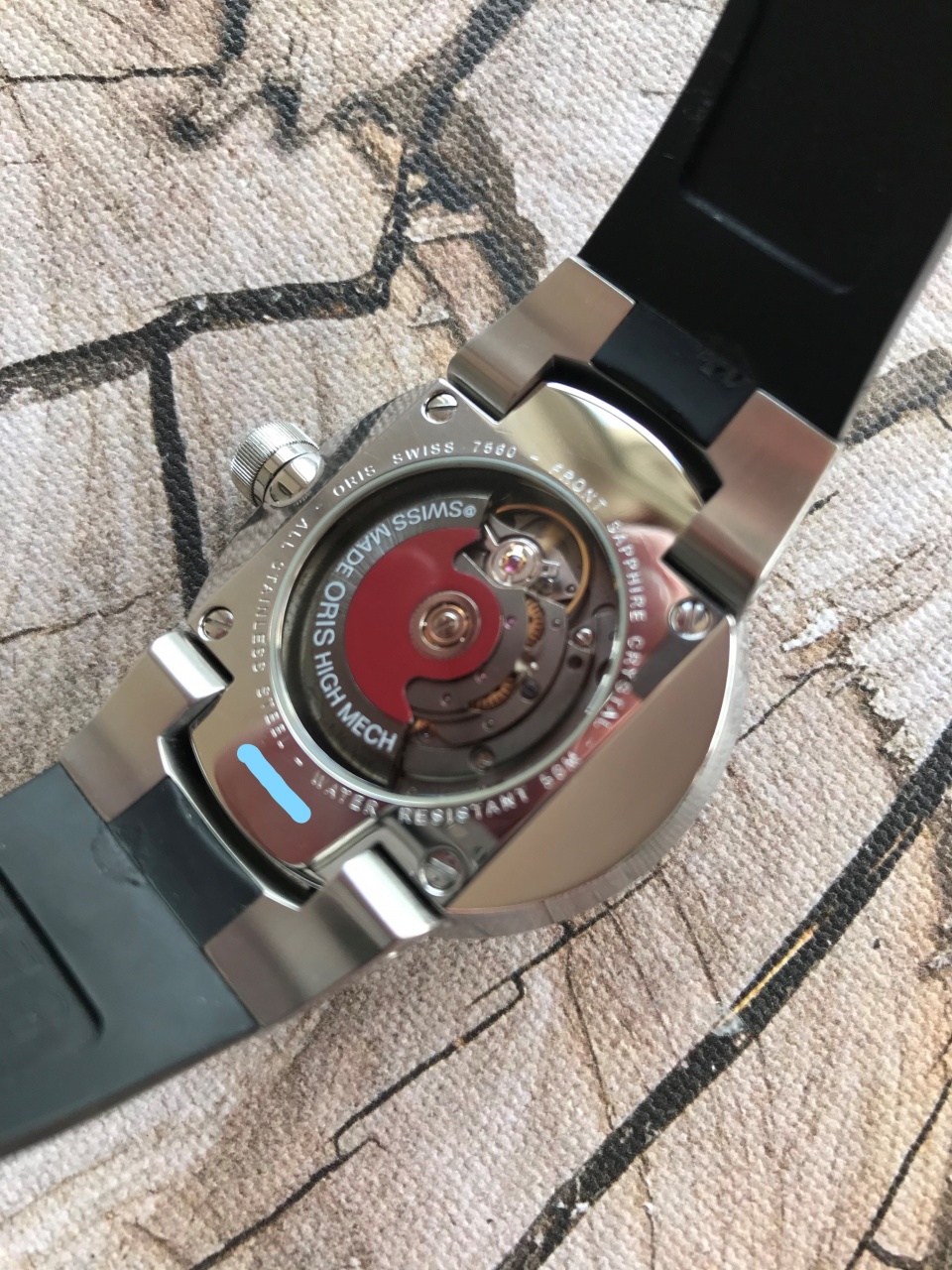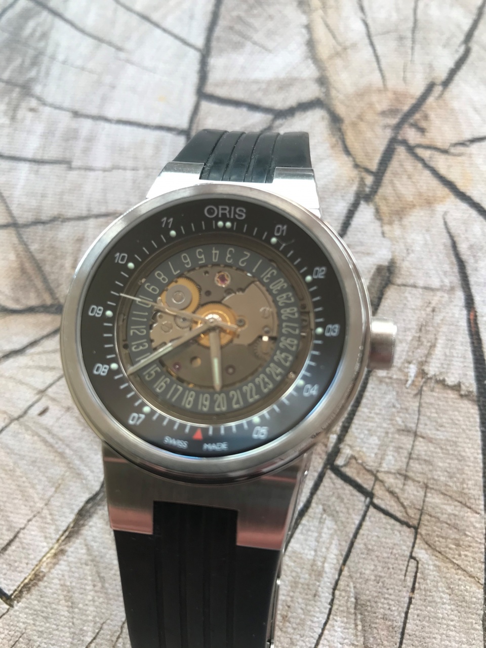 Калибр: ORIS 733, на базе SW 200. Запас хода: 38 ч. 28'800 A/ч, 4 Гц. На 26-ти камнях.