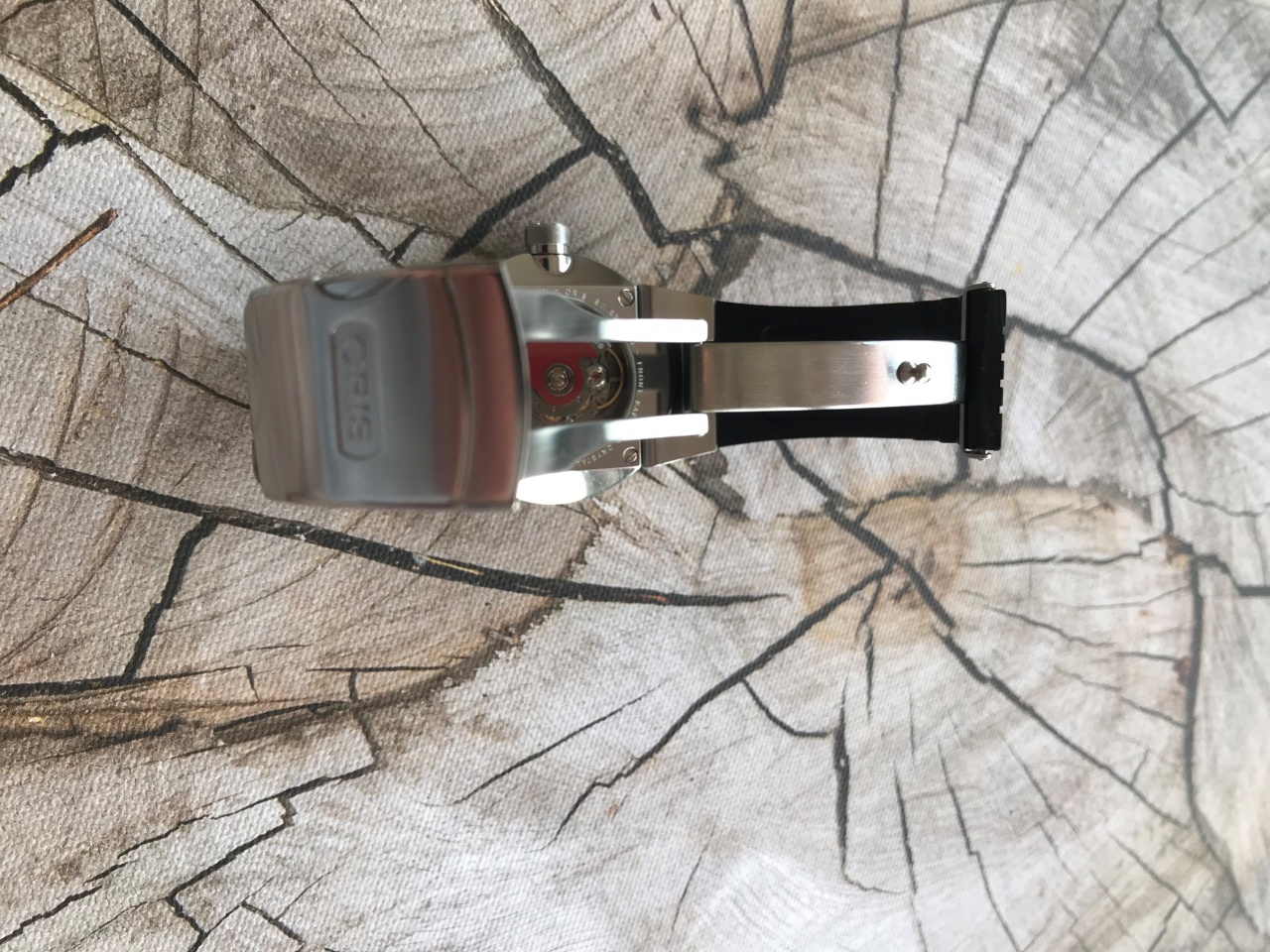 Ремешок: Каучуковый (на запястье 18,5см!), раскладывающаяся застежка клипса с микро регулировкой и боковой кнопкой. Циферблат: Черный, часовая шкала, скелетон по центру.
