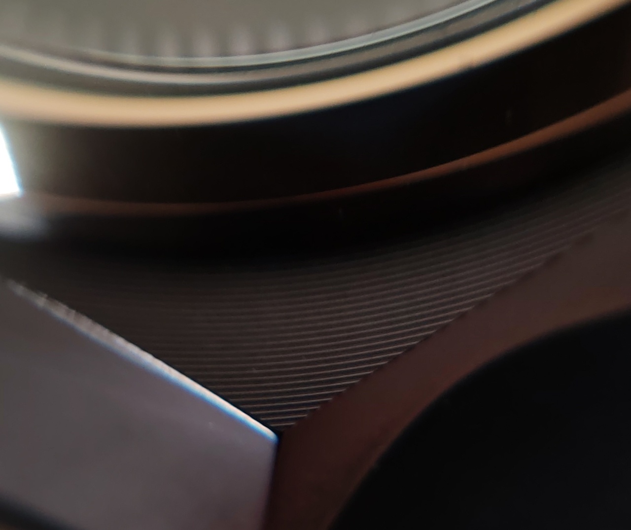 Качество исполнения часов очень и очень достойное, как и уровень работы дизайнеров. Корпус полированный в круг, но учитывая IP-покрытие, может, царапин будет и не очень много. Верхняя панель кажется матовой, а на самом деле покрыта очень мелким концентрическим круговым узором.