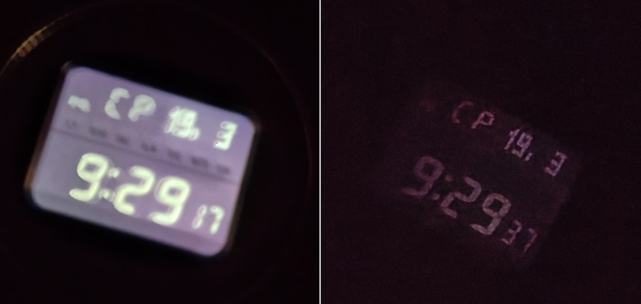Инверсный дисплей очень хорошо вписывается в гамму часов, но читается на дневном свету похуже классических дисплеев (что ожидаемо). В темноте вопрос решает диодная подсветка — мягкая, неяркая и не бьющая по глазам. Правда, и подсветить часами какую-нибудь замочную скважину не выйдет. Выглядит это вот так (чукча не фотограф, поэтому на одном кадре есть свет, а на другом резкость):