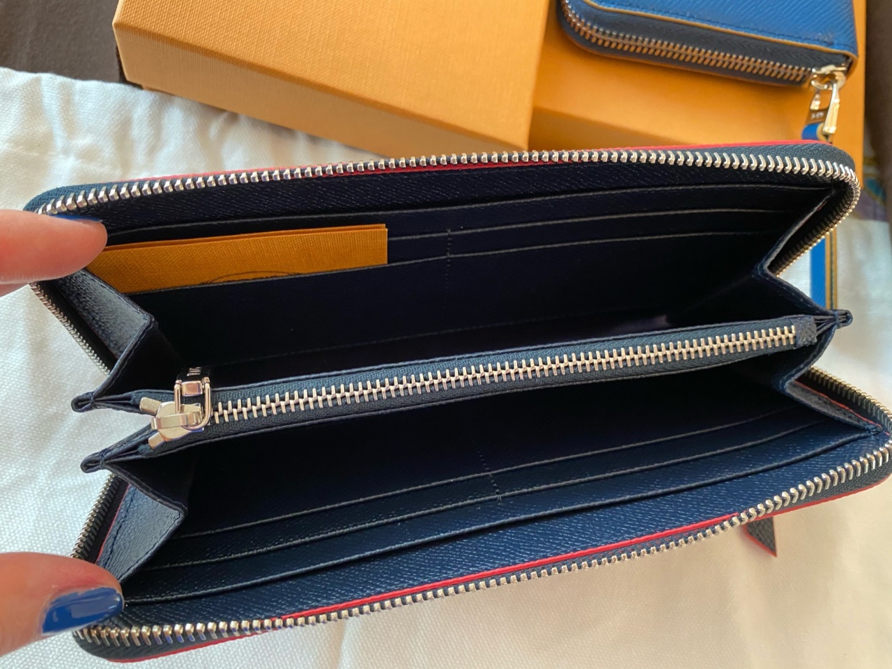 Портмоне на молнии по периметру. Отличная стойкая темно-темно-синяя кожа выделки saffiano, стильная отделка красным кантом по периметру и на хлястике - смотрится очень стильно! Овальное металлическое лого с надписью бренда красными буквами. Внутри тисненый логотип бренда, язычок зиппера с гравировкой бренда. Легко уместит паспорт и авто документы, мобильный телефон.