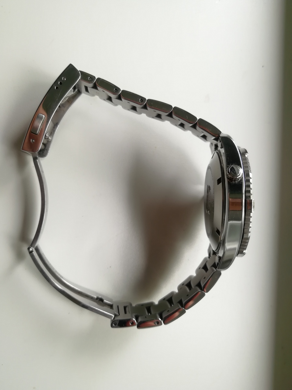 Диаметр стального корпуса 41 мм, керамический безель, автоматический подзавод, водонепроницаемость 500 м. Часы в очень хорошем состоянии без серьезных повреждений корпуса, идут точно.