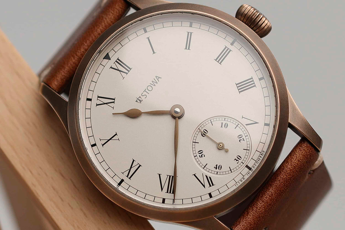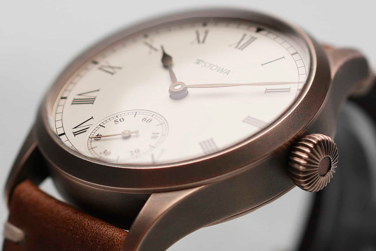 Корпус часов диаметром 41 мм классической для Stowa геометрии выполнен из бронзы и уже имеет предварительное патинирование, которое будет усиливаться со временем. Серебряный циферблат заполнен римскими печатными цифрами. Интересной особенностью являются стрелки – их гармонирующий с корпусом цвет достигается с помощью термической обработки, аналогичной той, которая применяется для термического синения стали.