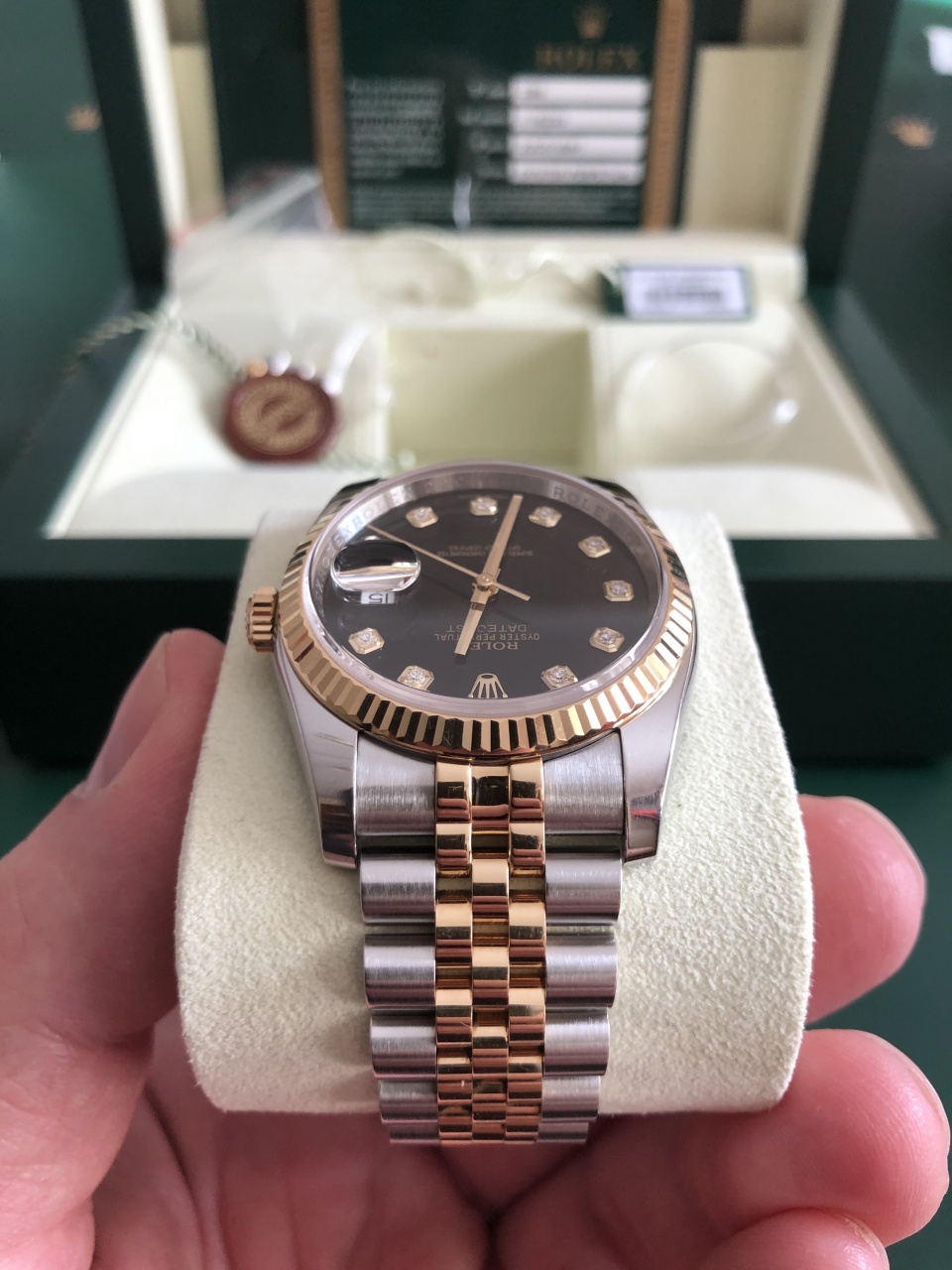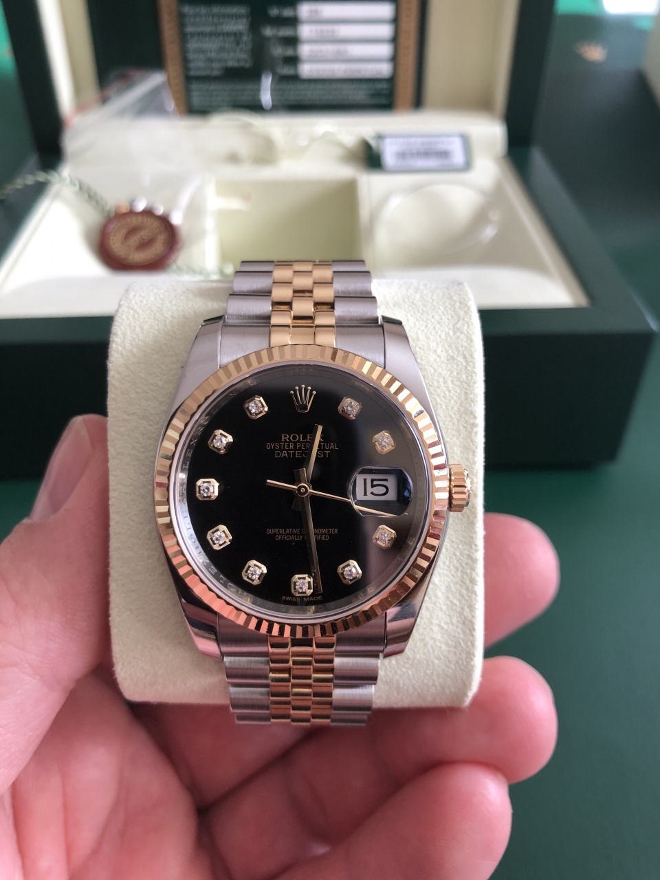 В модели Datejust диаметром 36 мм установлен калибр 3135 с автоматическим подзаводом, полностью разработанный и изготовленный мастерами Rolex. Как и все механизмы Rolex Perpetual, калибр 3135 имеет сертификат швейцарского хронометра, выдаваемый сверхточным часам, успешно прошедшим тестирование в Официальном швейцарском институте хронометрии (COSC). Конструкция, одинаковая для всех механизмов коллекции Oyster, придает модели несравненную надежность.