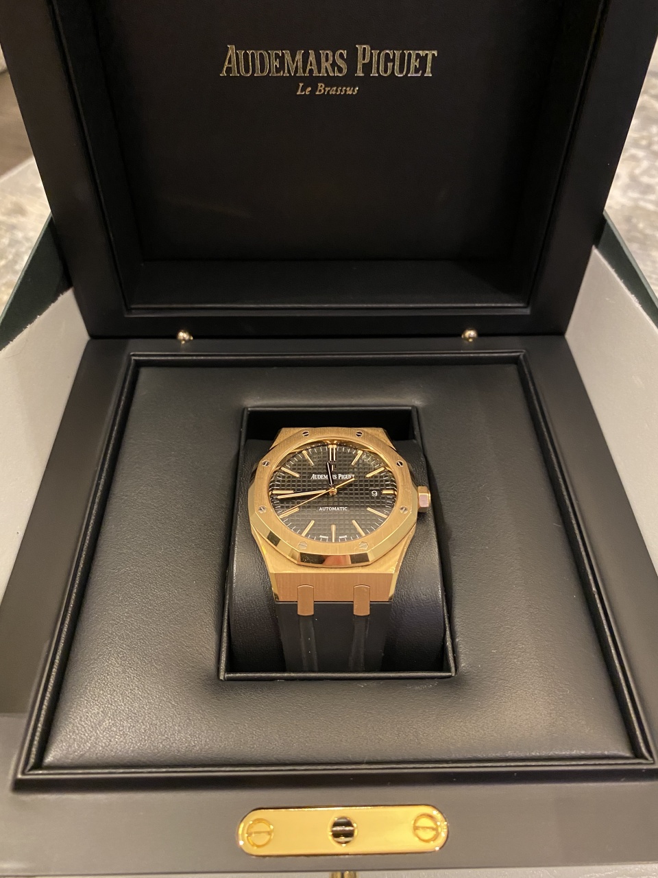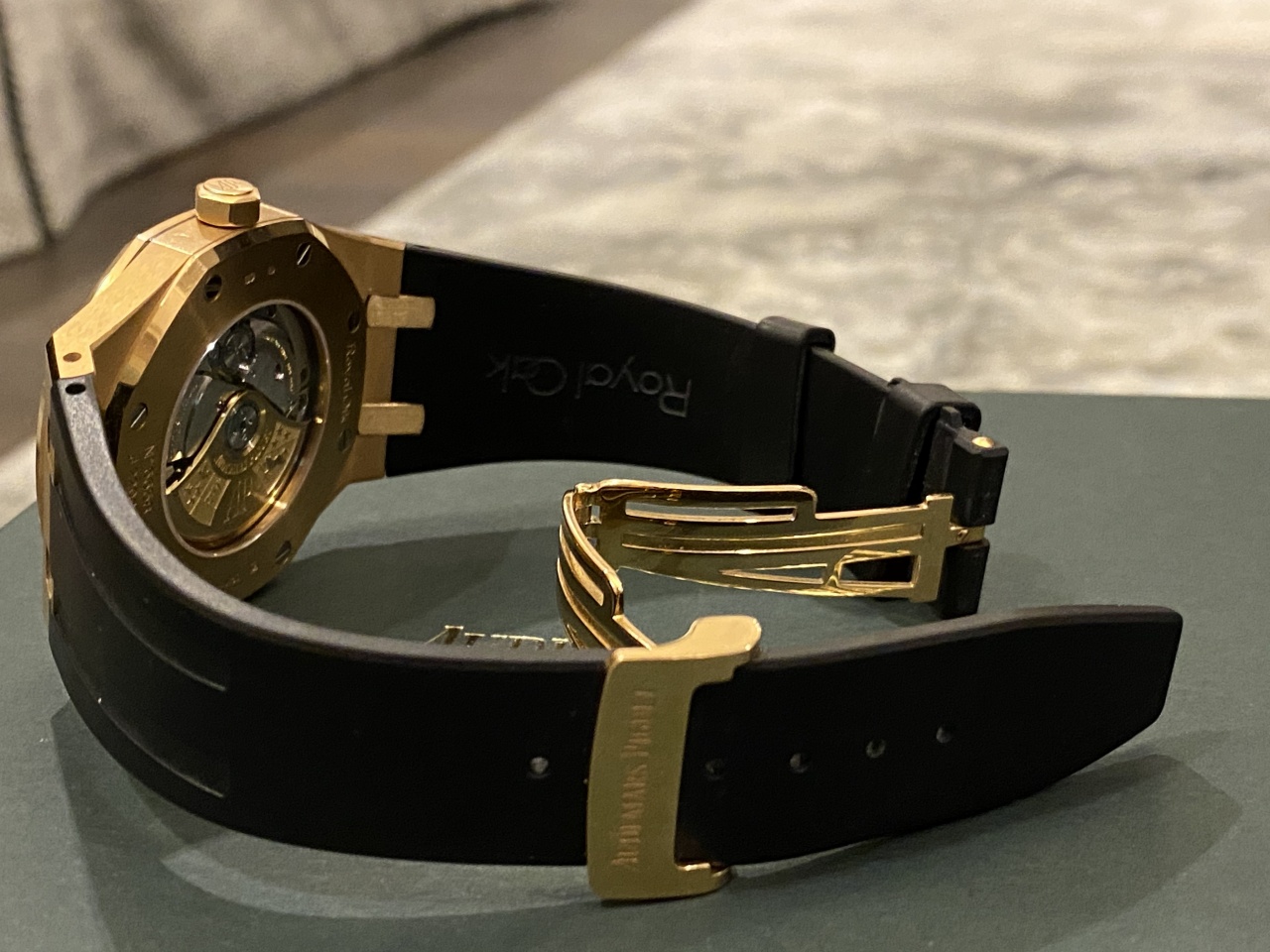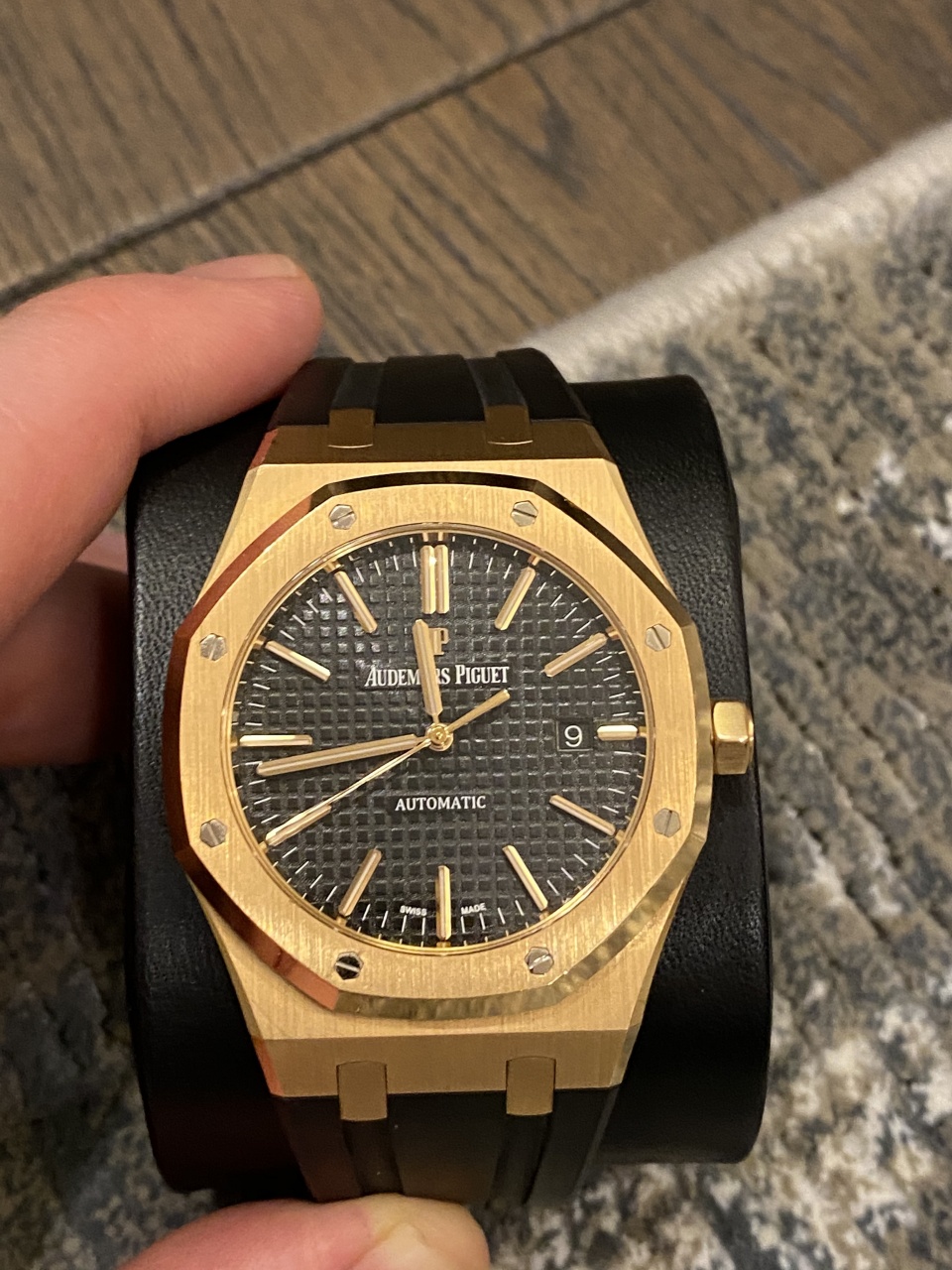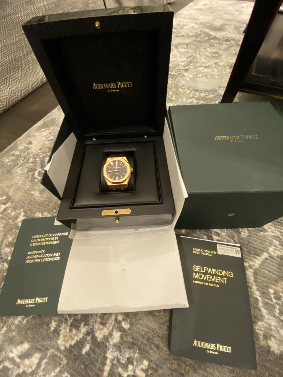 Неспешно продаю часы Audemars Piguet Royal Oak Selfwinding 41 mm Ref. 15400OR.OO.D002CR.01 в корпусе из розового золота 18к, размером 41 х 9,8 мм и водонепроницаемостью 50 м. Внутри корпуса установлен автоматический механизм, Калибр 3120. На черном гильошированном циферблате отображаются часы, минуты, секунды, дата. Запас хода 60 часов. На часах установлен оригинальный каучуковый ремень (докупался дополнительно).