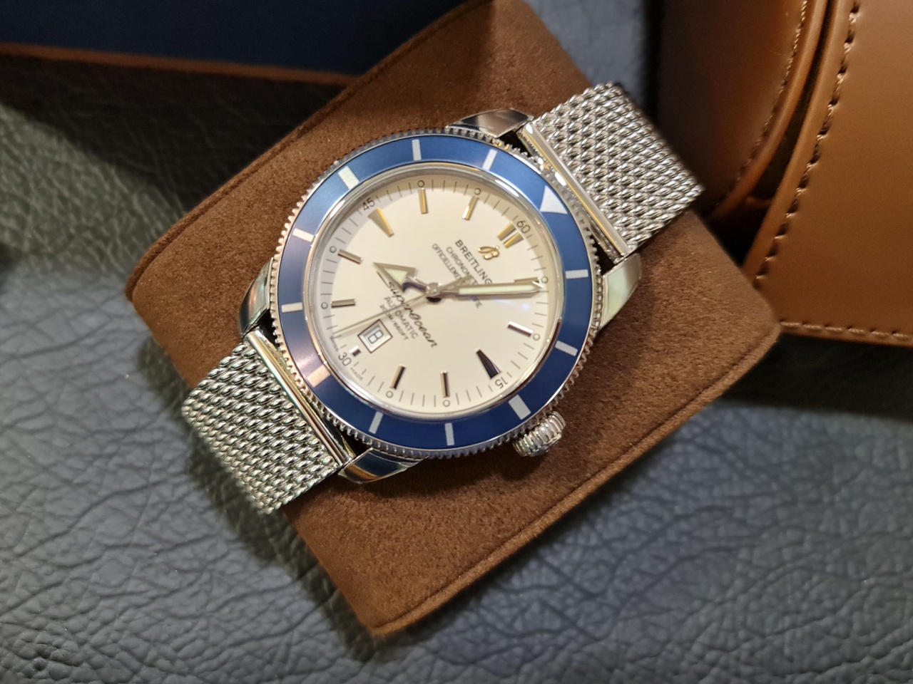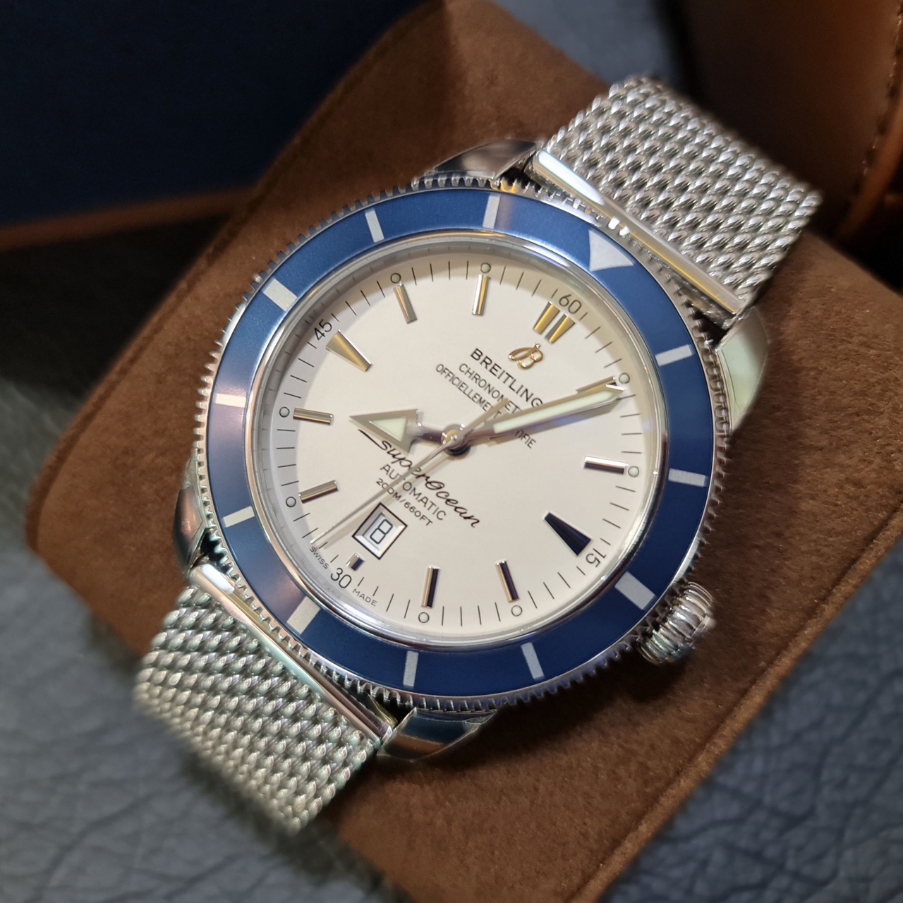 Доступные в двух размерных классах – с диаметром 42 и 46 мм – эти часы с водонепроницаемостью до глубины 200 метров (660 футов) перекликаются своей функциональностью и элегантностью дизайна с легендарной моделью 1950-х годов. Черный, голубой или зеленый вращающийся в одном направлении безель сочетается с циферблатами различных расцветок, его можно также дополнить версией 42 мм и безелем из красного золота 18 карат. Оригинальный стиль этой благородной классики подчеркивается стальным браслетом миланского плетения либо перфорированным каучуковым ремешком, обладающим застежкой, которая для большего удобства снабжена регулятором длины, позволяющим изменять длину ремешка за считанные секунды. Стальной корпус. Синий стальной безель. Механизм с автоподзаводом Breitling 17, собран на 25 драгоценных камнях, балансовая частота 28800 пол/час, с запасом хода в 40 часов. Центральная часовая, минутная и секундная стрелки, окошко даты в положении на 6 часов. Вращающийся в одном направлении, с запором. Выпуклое сапфировое стекло, с антибликовым покрытием с обoих сторон. Серебристо-белый циферблат, стрелки покрыты люминесцентным составом. Браслет Оушен Классик Сталь.