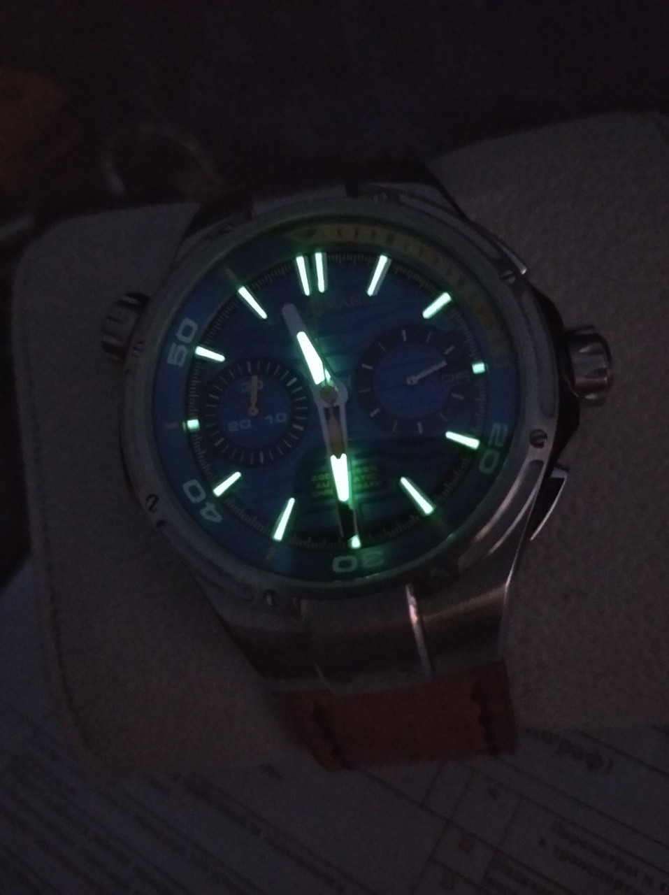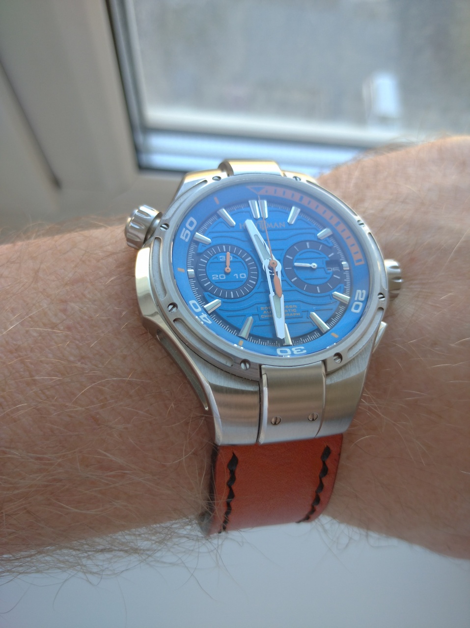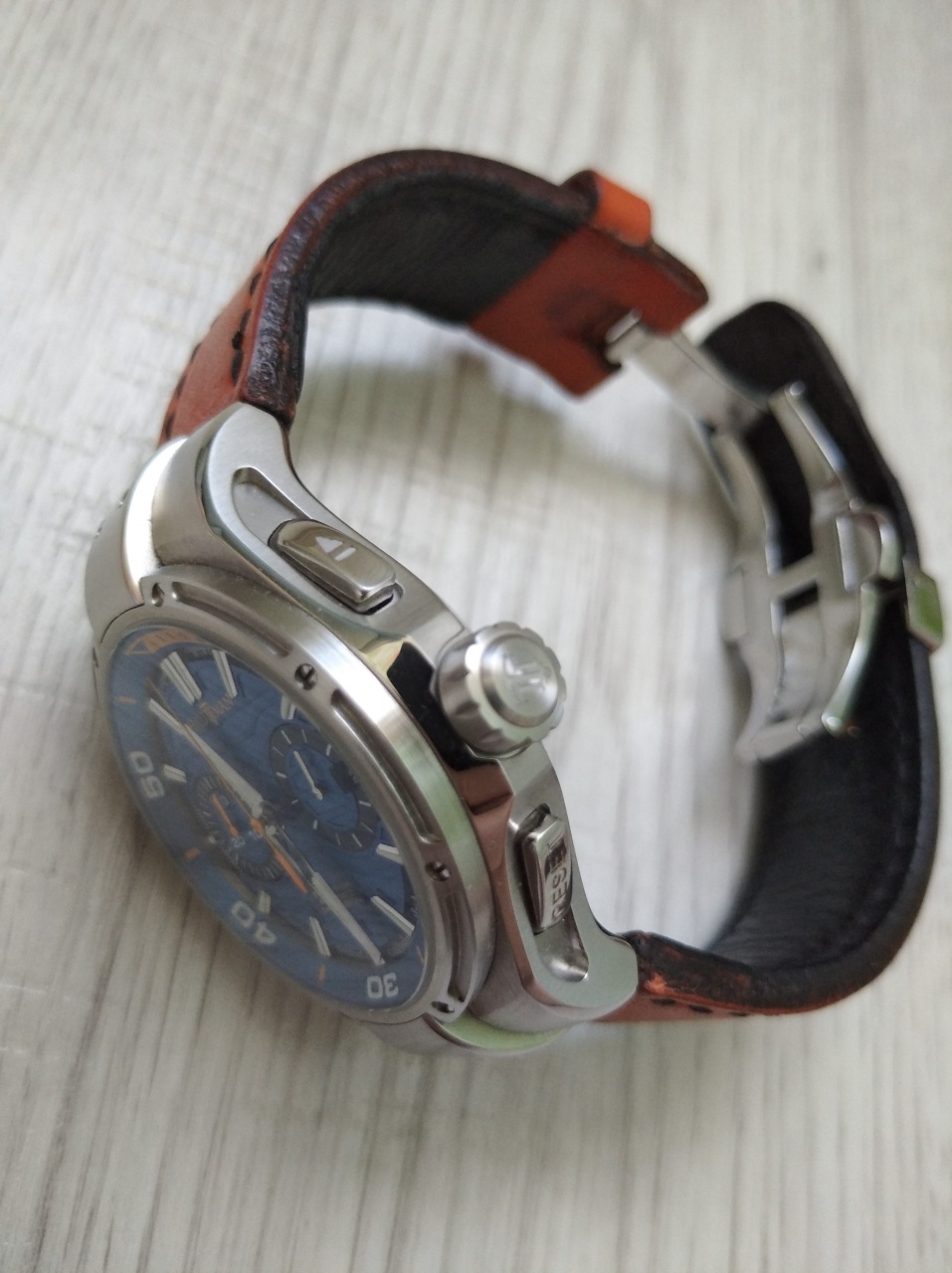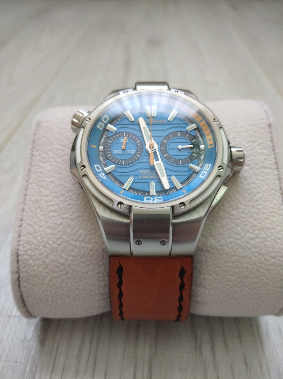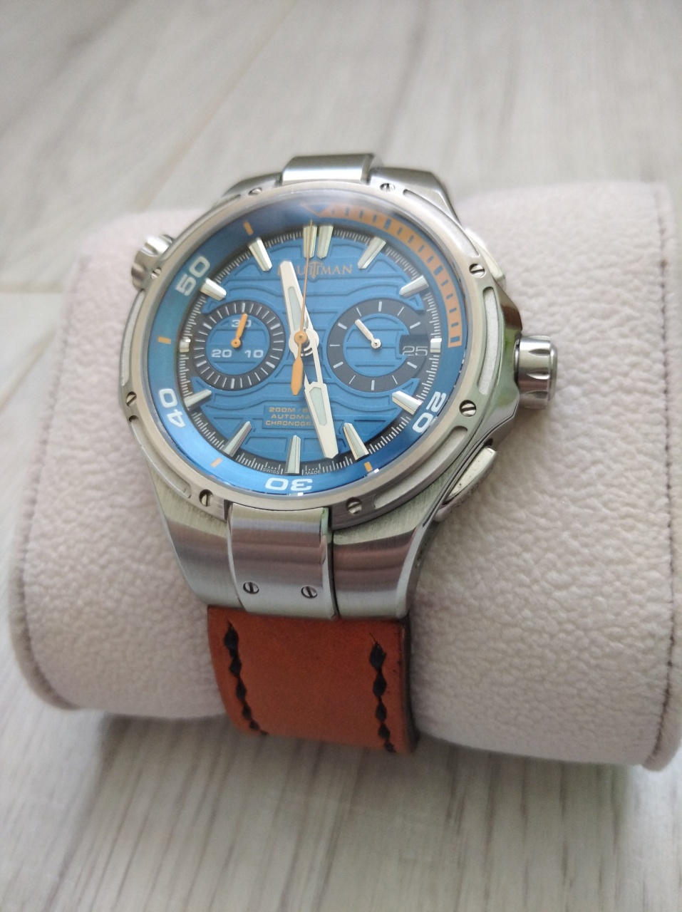 Циферблат: двухуровневый, яркий синий с черным, накладные метки с люмом, дата и секунда на 3 часа, накопитель 30мин хронографа на 9 часов.