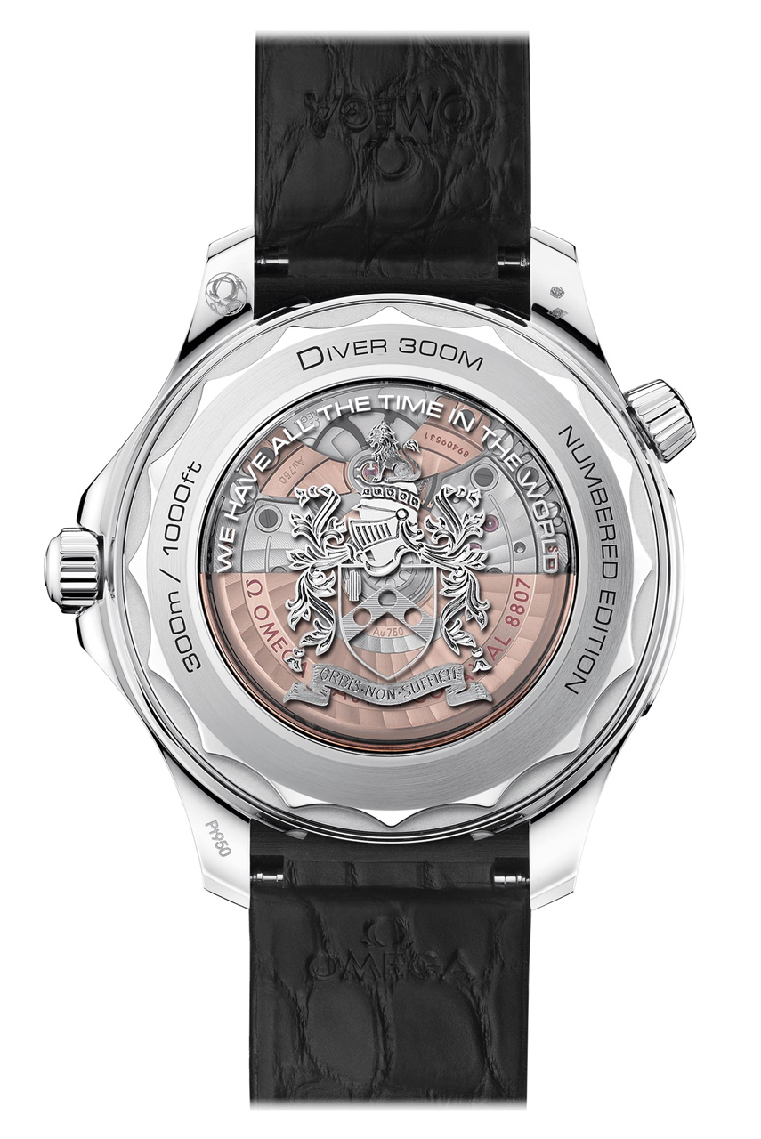 Сапфировое стекло в задней крышке часов украшено изображением Герба семьи Бондов, который вырезан в сапфире лазером и заполнен платиной. Сквозь него можно рассмотреть мануфактурный калибр Omega 8807 Master Chronometer, автоматический механизм с коаксиальным спуском, работающий на частоте 25 200 пкч и обеспечивающий автономность 55 часов. Балансовый мост и ротор системы автоподзавода выполнены из цельного золота 750 пробы. Новая модель предлагается на черном ремне из кожи аллигатора с застежкой из платиново-золотого сплава, в комплекте также имеется черный каучуковый ремень. Часы будут поставляться в специальном чехле для путешествий Globe-Trotter, перевязанном ремнями в стиле НАТО. Omega Seamaster Diver 300M «James Bond» Numbered Edition (ref. 210.93.42.20.01.001) будут нумерованными, но не лимитированными, стоимость составит 48 800 евро.