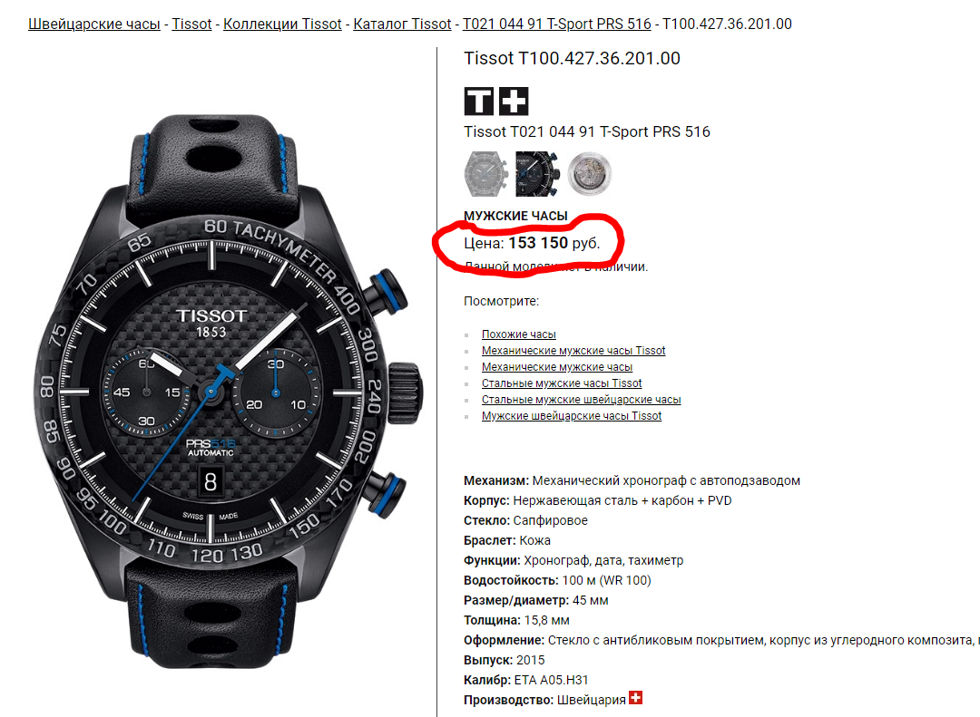 TISSOT PRS516 Auto Chrono T1004273620100. Ремешок / Синие акценты / VALJOUX 7750 / d=45mm - Часовой форум Watch.ru