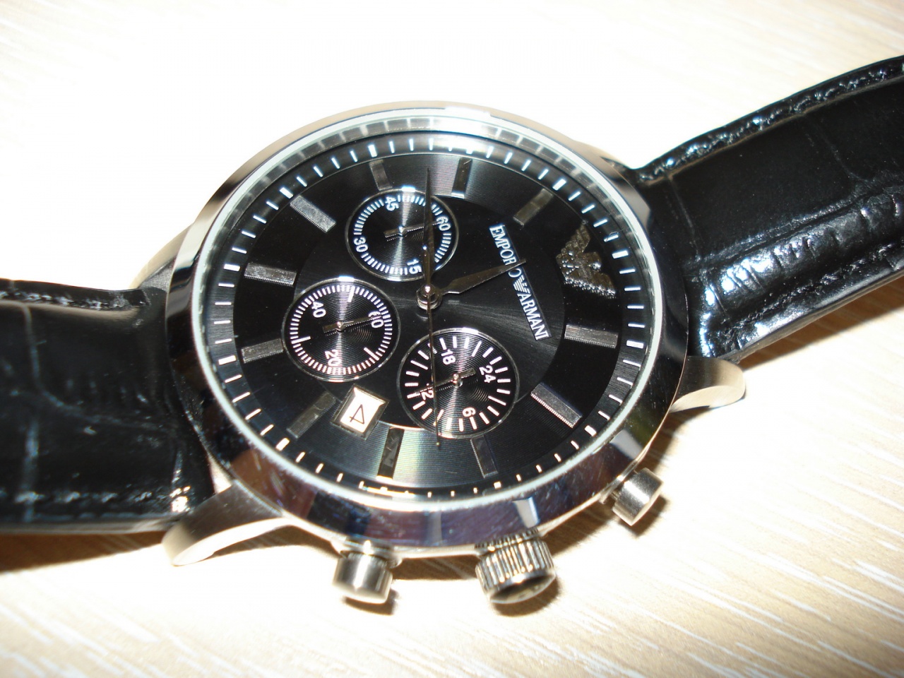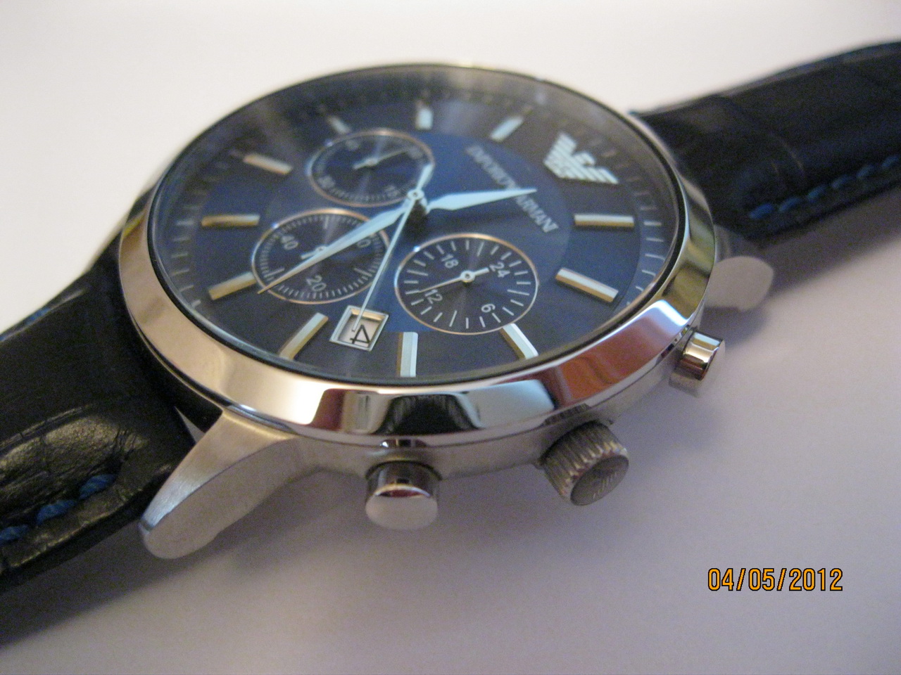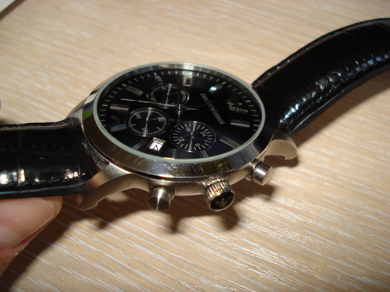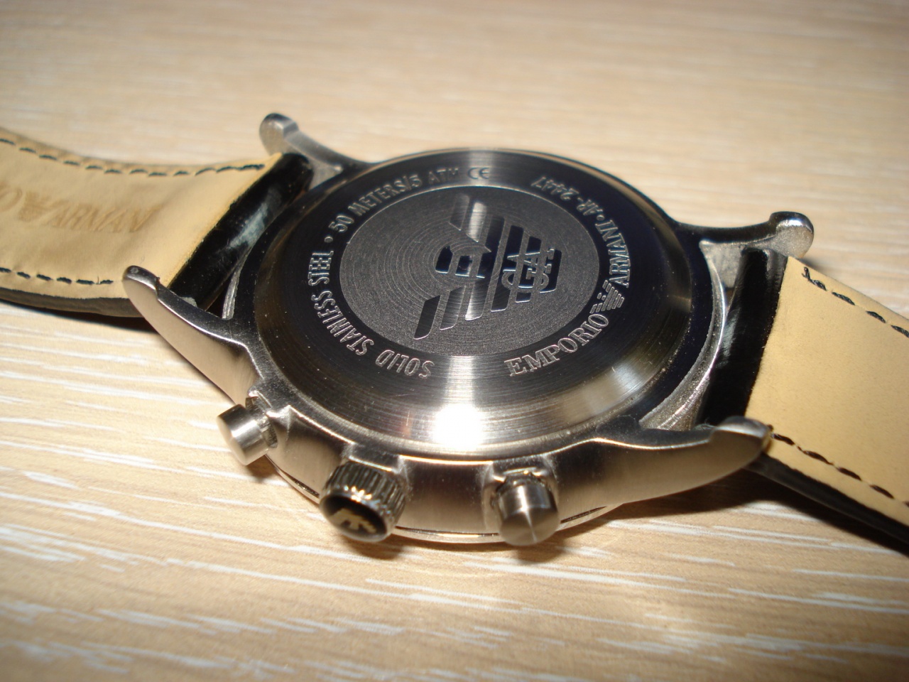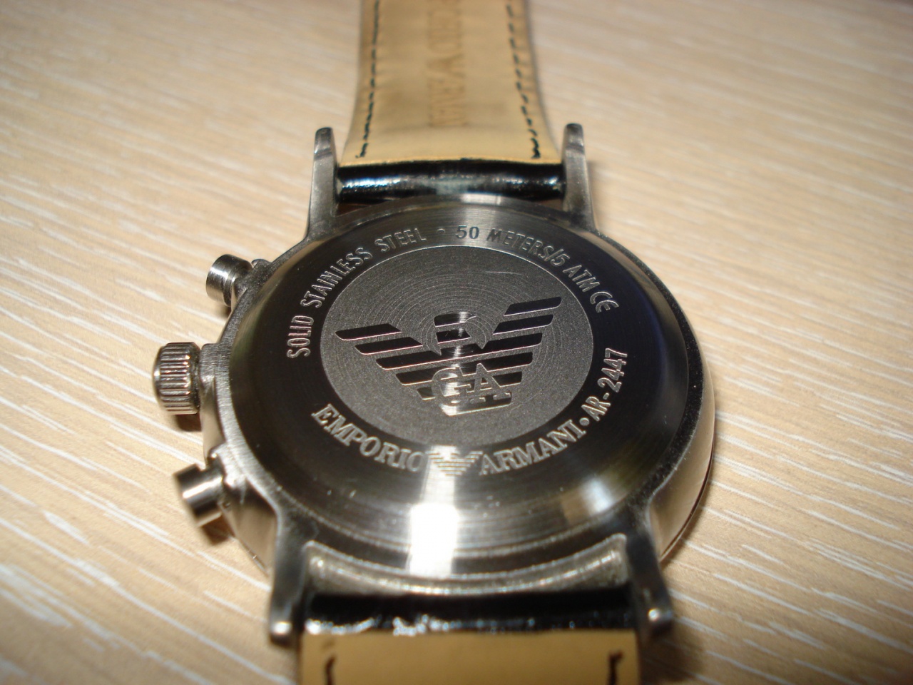 Итак, не хочется вас расстраивать, но похоже у вас подделка, ЗГ - во-первых не должно быть никаких букв ЕА, только орёл (логотип Армани), и только в виде гравировки на металле (конкретно ваша модель), и орёл должен быть маленький (тонкий и чёткий отпечаток), просто есть копии, где он какой то большой на всю головку...
