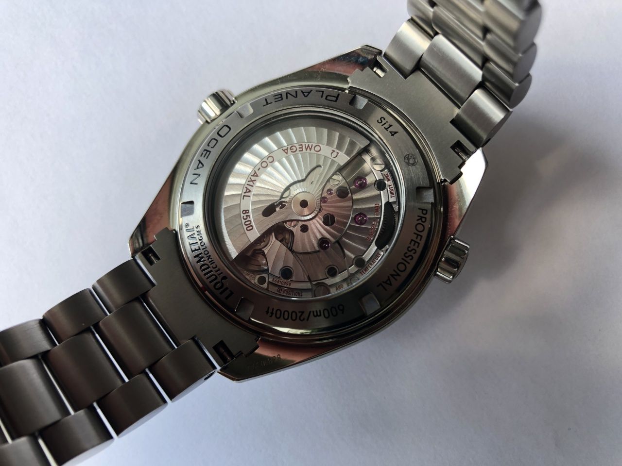 Часы OMEGA Seamaster Planet Ocean 600M, оснащенные гелиевым клапаном, сохраняют водонепроницаемость на глубинах до 60 бар (600 метров / 2000 футов). Коаксиальный калибр OMEGA 8500, механическое сердце этого сертифицированного хронометра, хорошо виден через прозрачную заднюю крышку.
