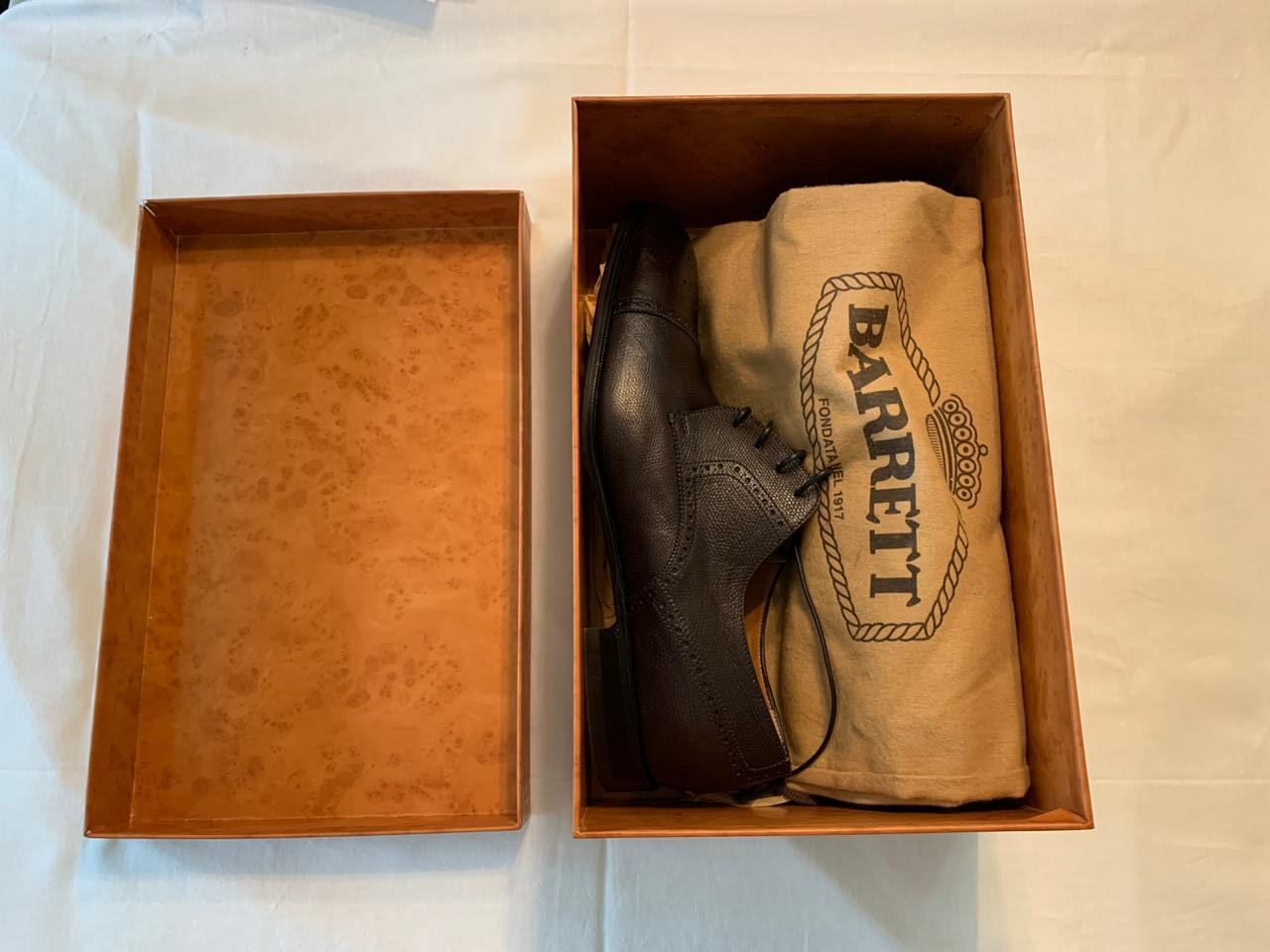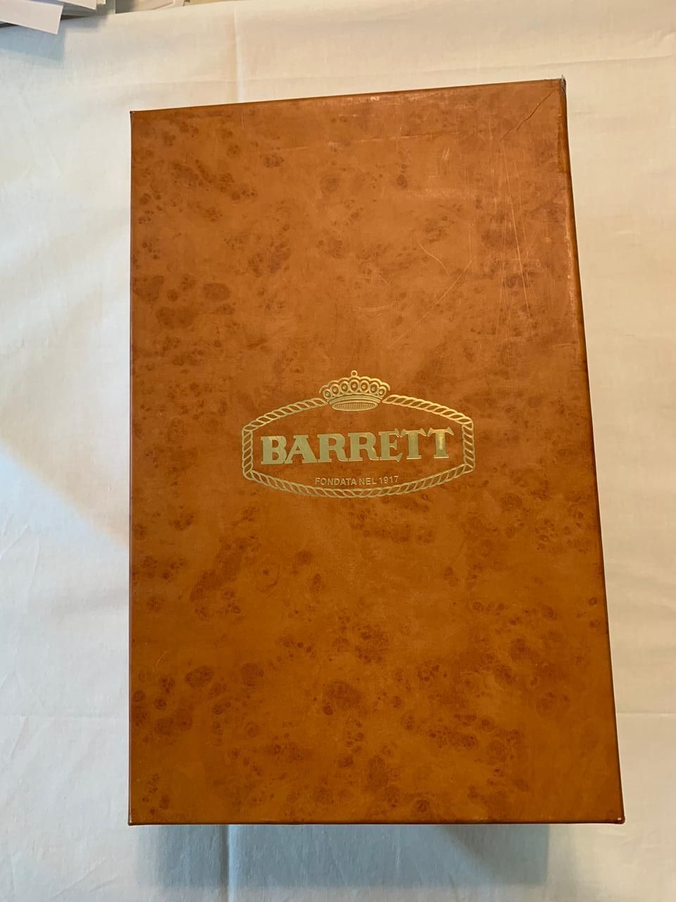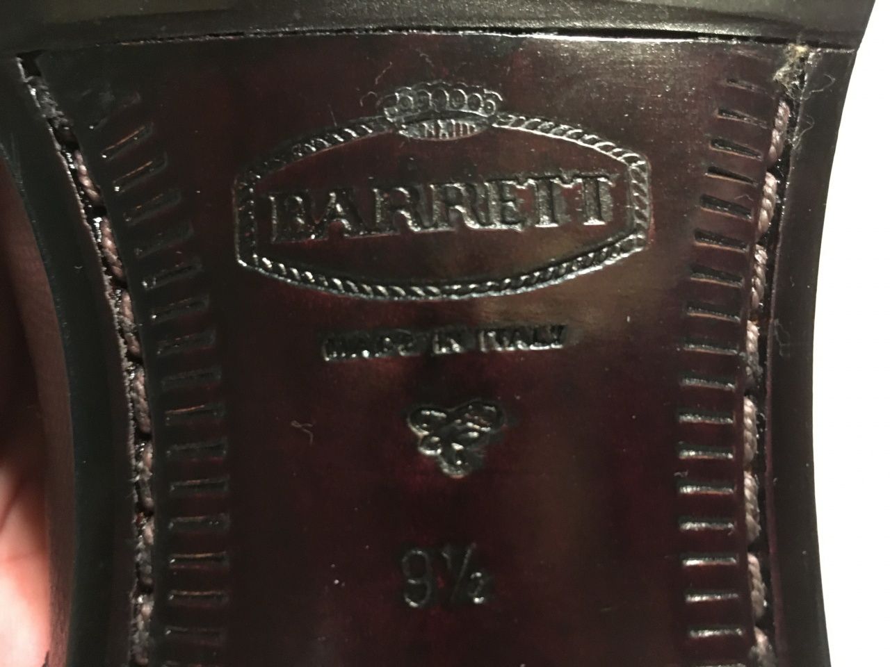 Продаются новые элегантные мужские кожаные дерби марки, основанной Джоном Ричардсоном Барреттом, из мягкой фактурной кожи оттенка горького шоколада превосходного исполнения, на удлиненном мысе ‒ перфорированный узор, как у брогов, модель дополнена невысоким устойчивым каблуком, внутри комфортная мягкая стелька из кожи, подошва из кожи с логотипом бренда, выполнена профилактика, гарантированный 100% оригинал, размер 9,5/43, 5, производство Италия.