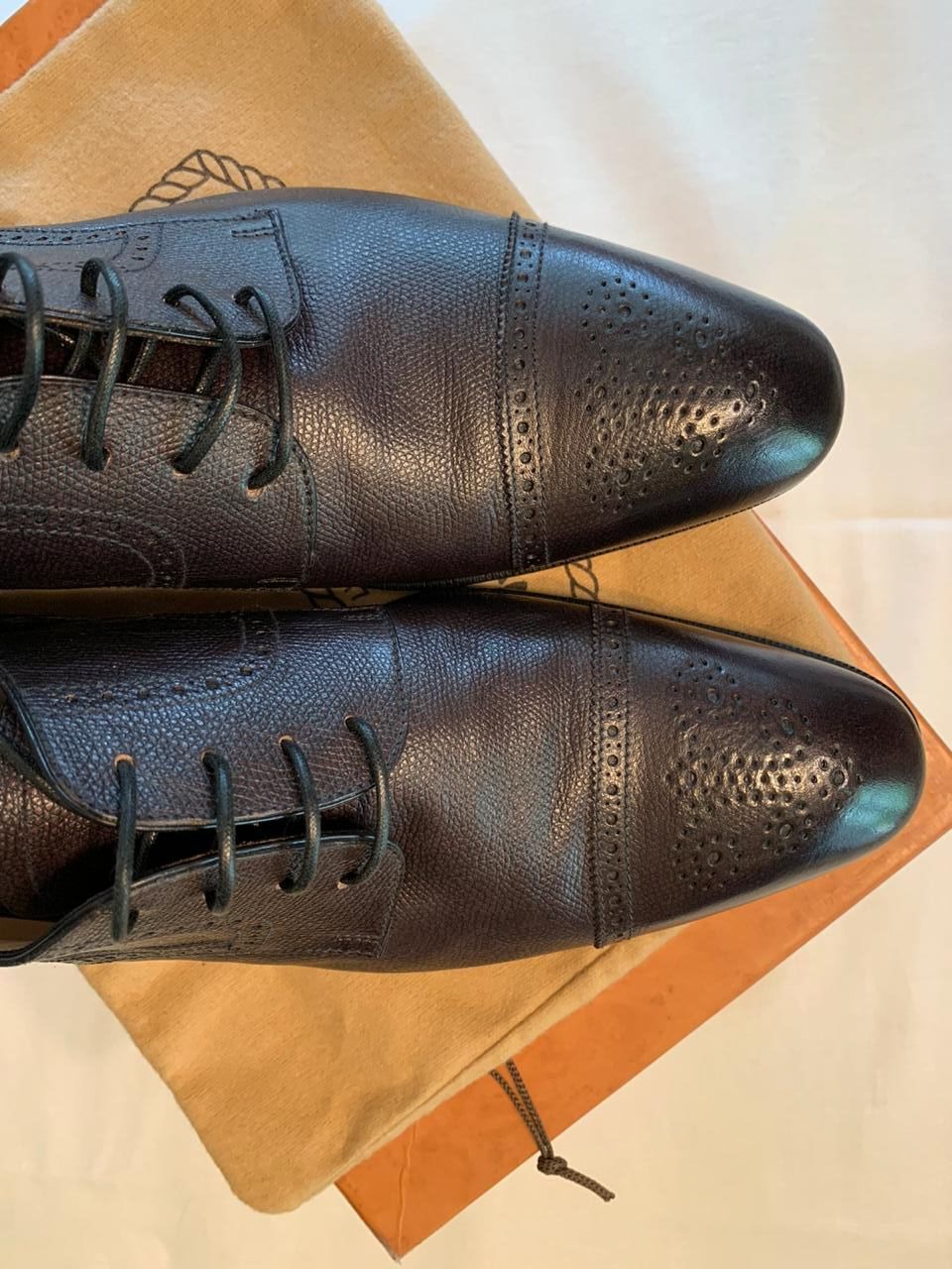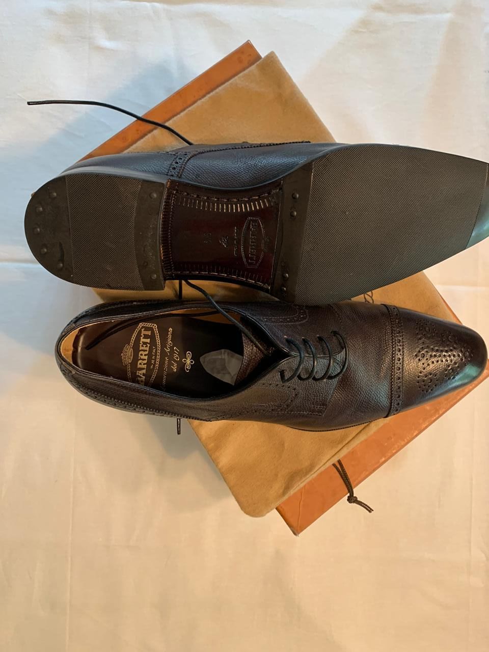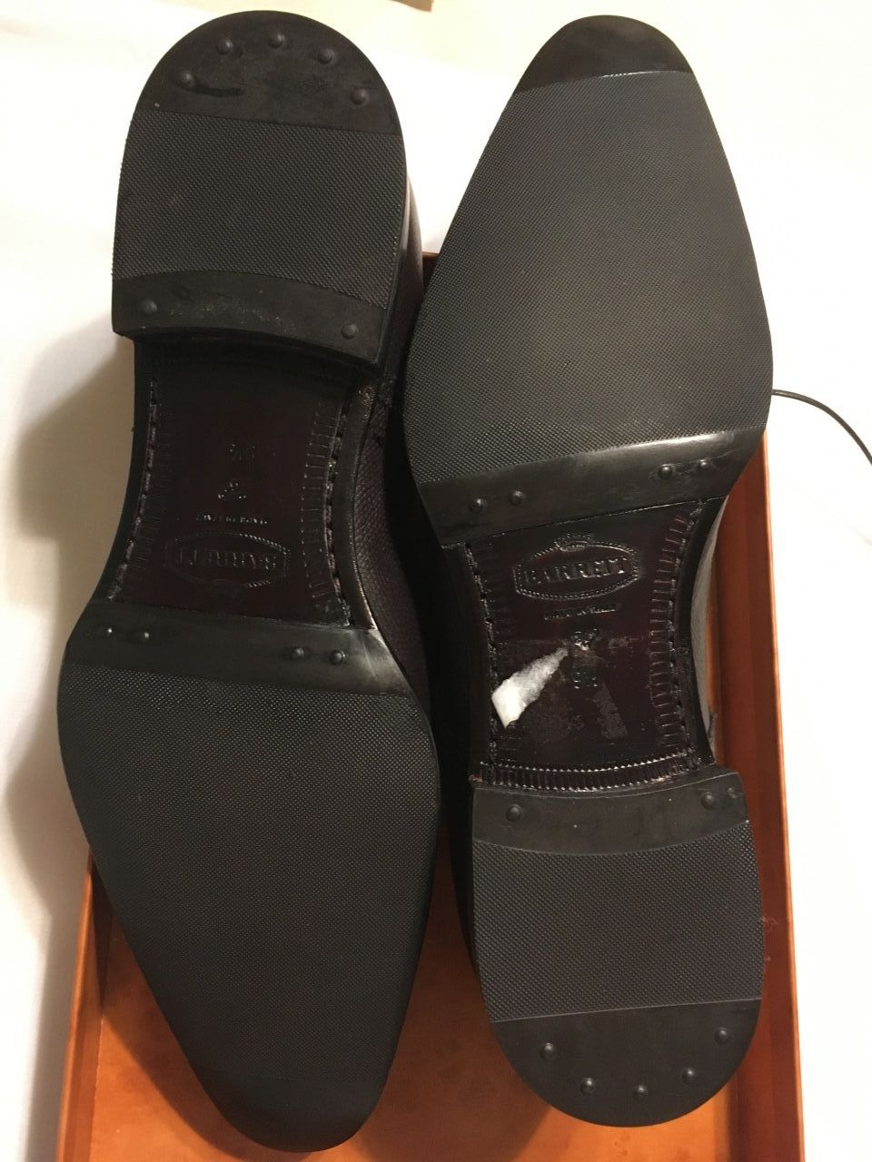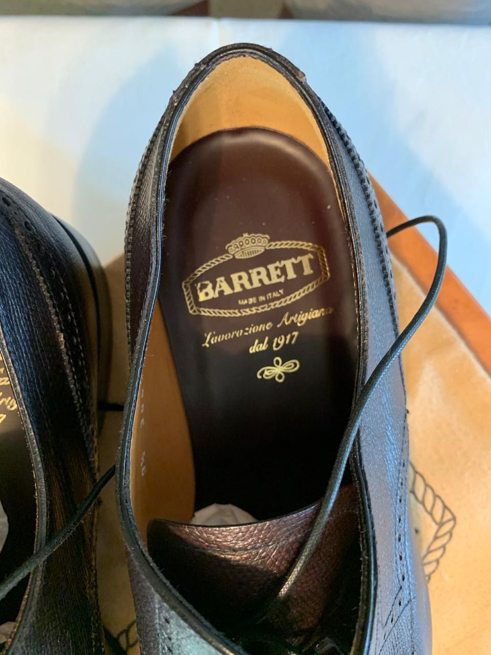 Продаются новые элегантные мужские кожаные дерби марки, основанной Джоном Ричардсоном Барреттом, из мягкой фактурной кожи оттенка горького шоколада превосходного исполнения, на удлиненном мысе ‒ перфорированный узор, как у брогов, модель дополнена невысоким устойчивым каблуком, внутри комфортная мягкая стелька из кожи, подошва из кожи с логотипом бренда, выполнена профилактика, гарантированный 100% оригинал, размер 9,5/43, 5, производство Италия.