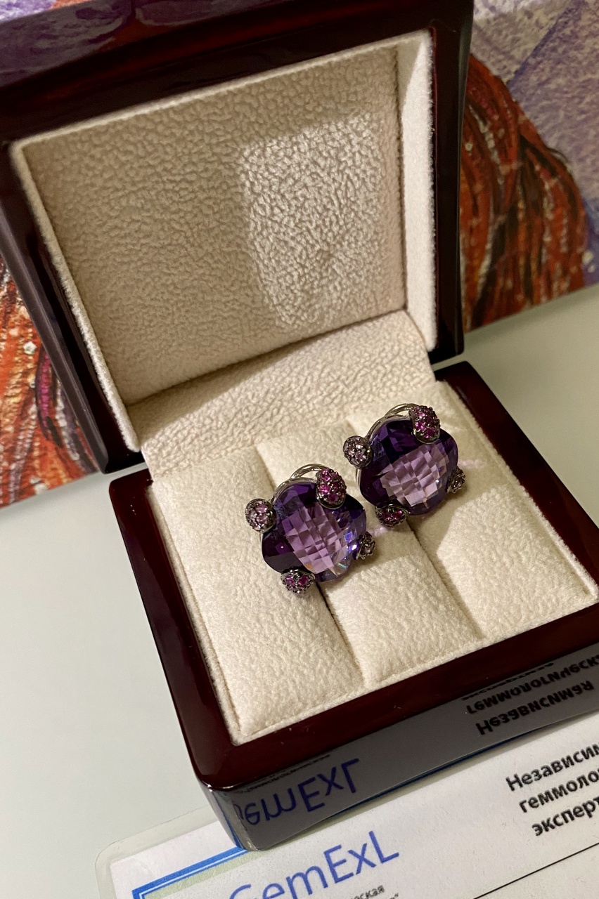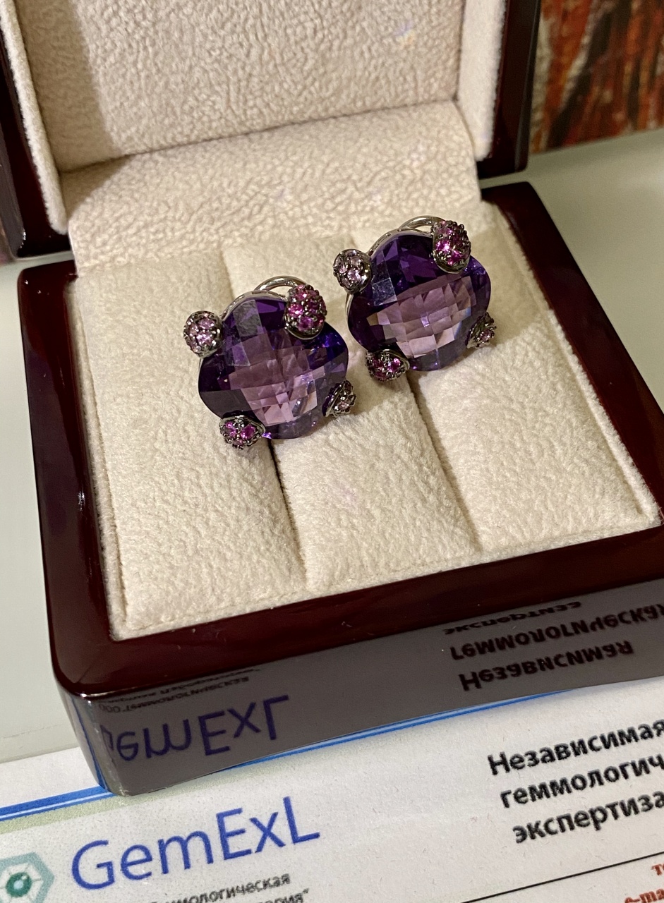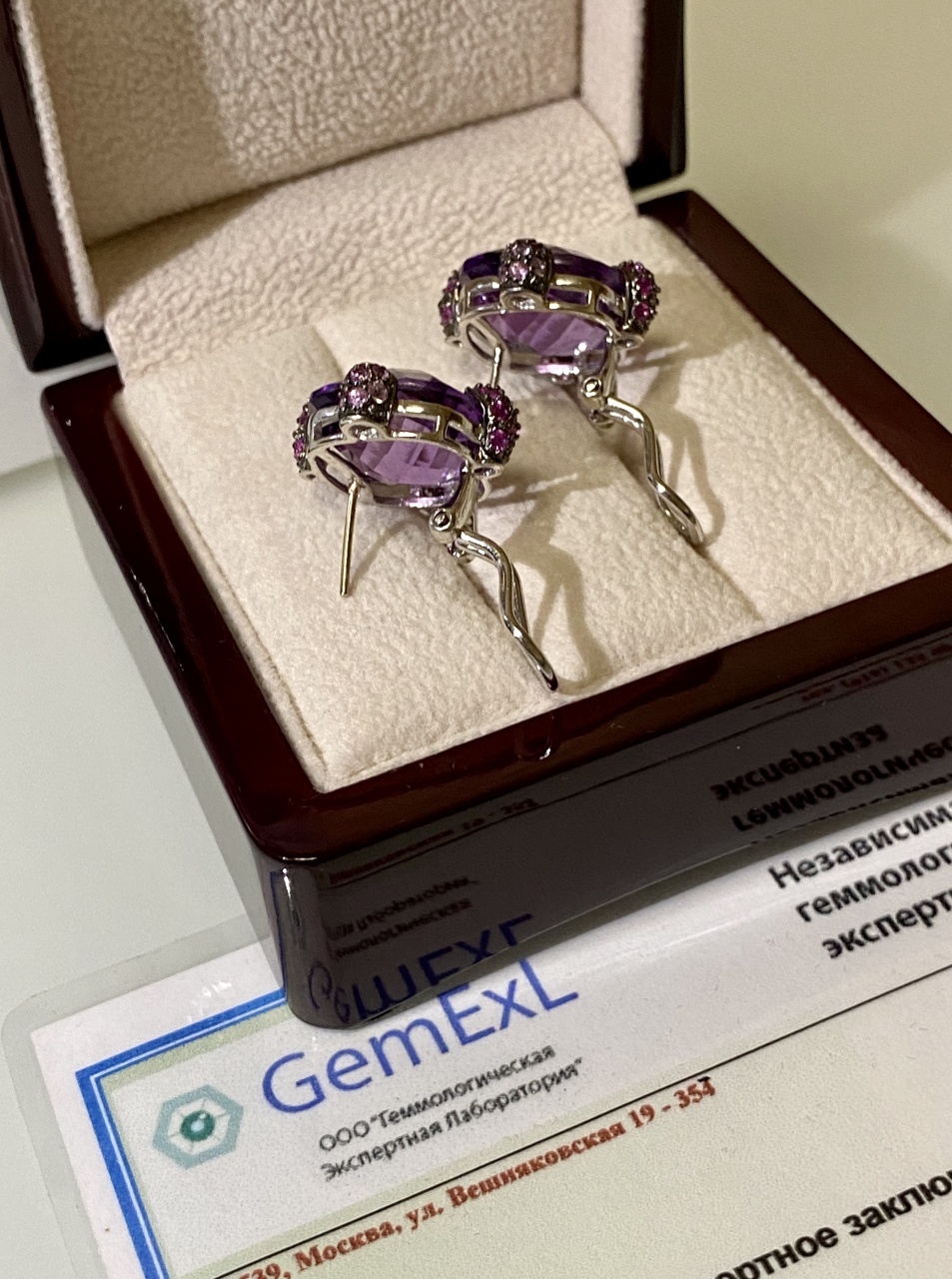 КРАСИВЫЕ СЕРЬГИ С АМЕТИСТАМИ 23,5 CT и САПФИРАМИ, СЕРТИФИКАТ, ТОРГ/ОТПРАВКА