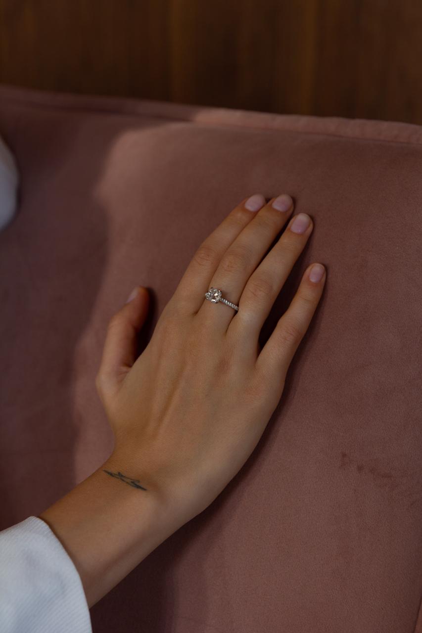 Новое кольцо из помолвочной коллекции Bazel Jewellery с бриллиантом Couchon на бриллиантовой дорожке. Украшение уникально в своем роде, подойдет по случаю помолвки.