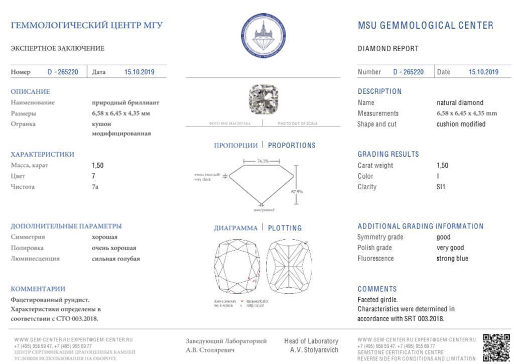 Супер-цена! Кольцо с бриллиантом Кушон 1,50 карата / сертификат МГУ