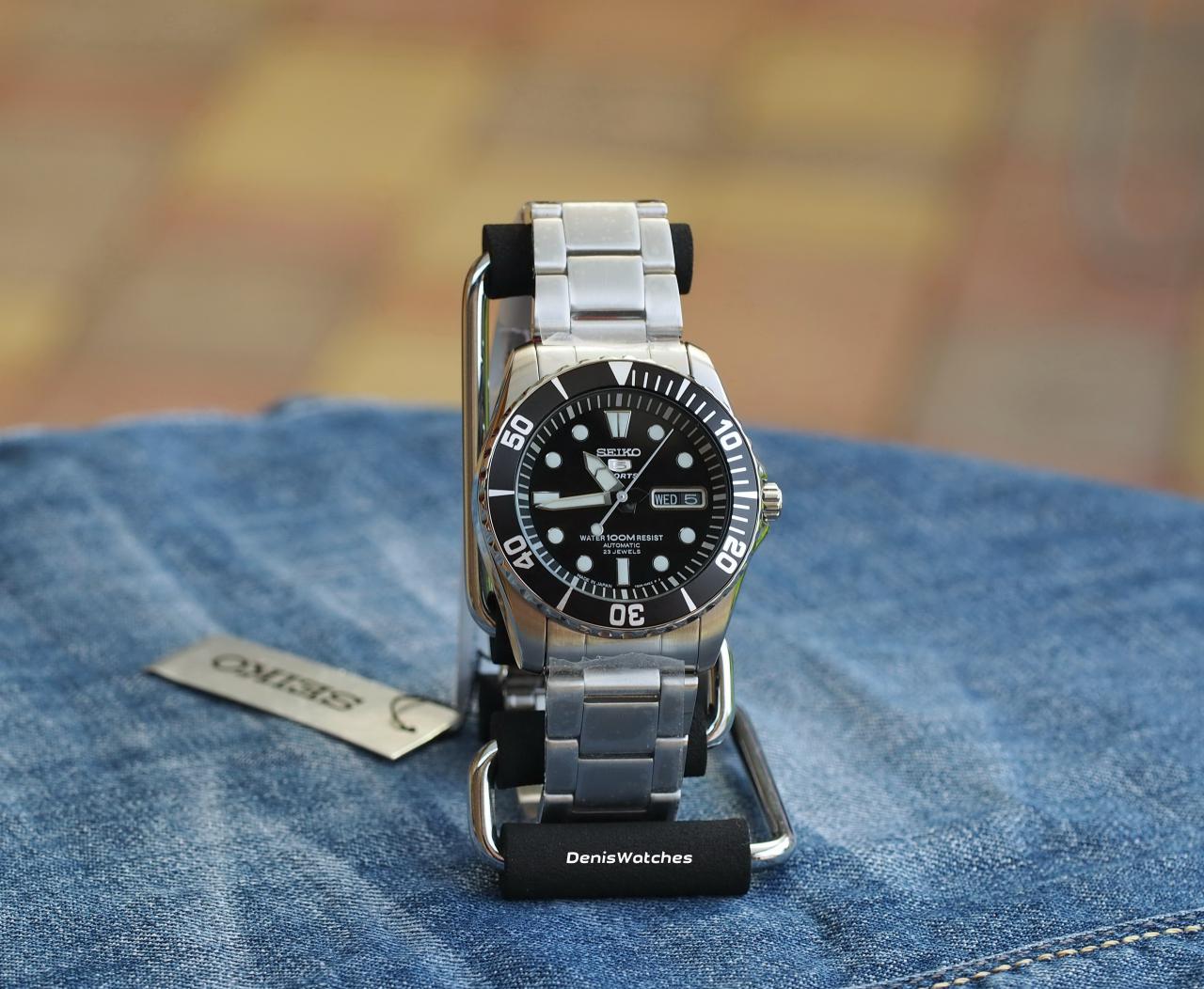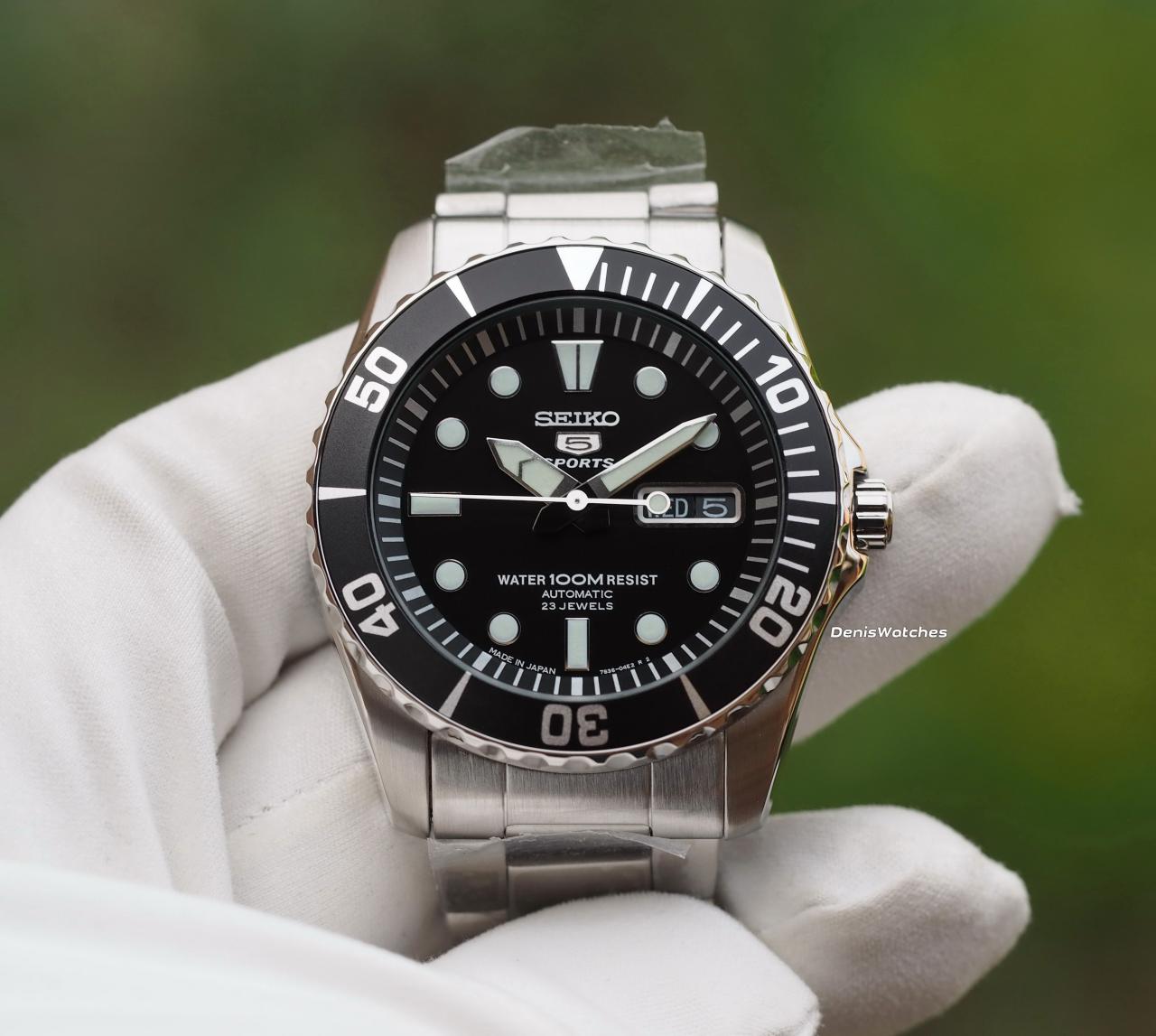 Черный глянцевый циферблат, накладные метки и лого Seiko 5 Sports