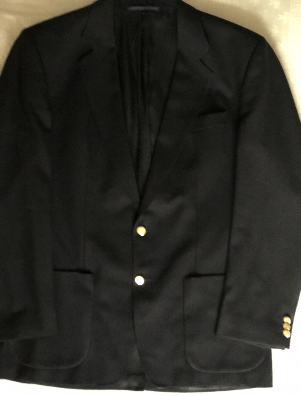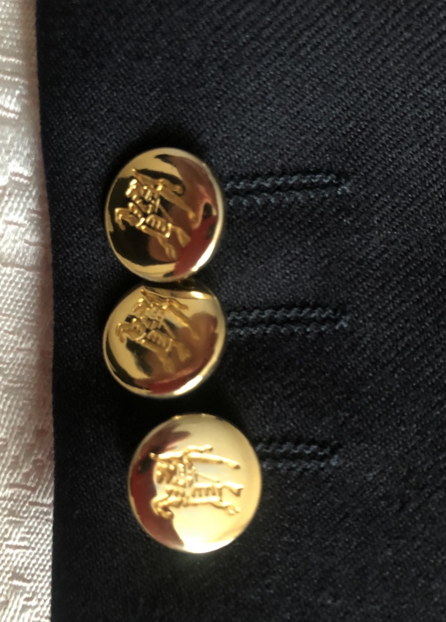 Высококачественная плотная шерсть темно-синего цвета, позолоченные пуговицы с узнаваемым логотипом бренда.
