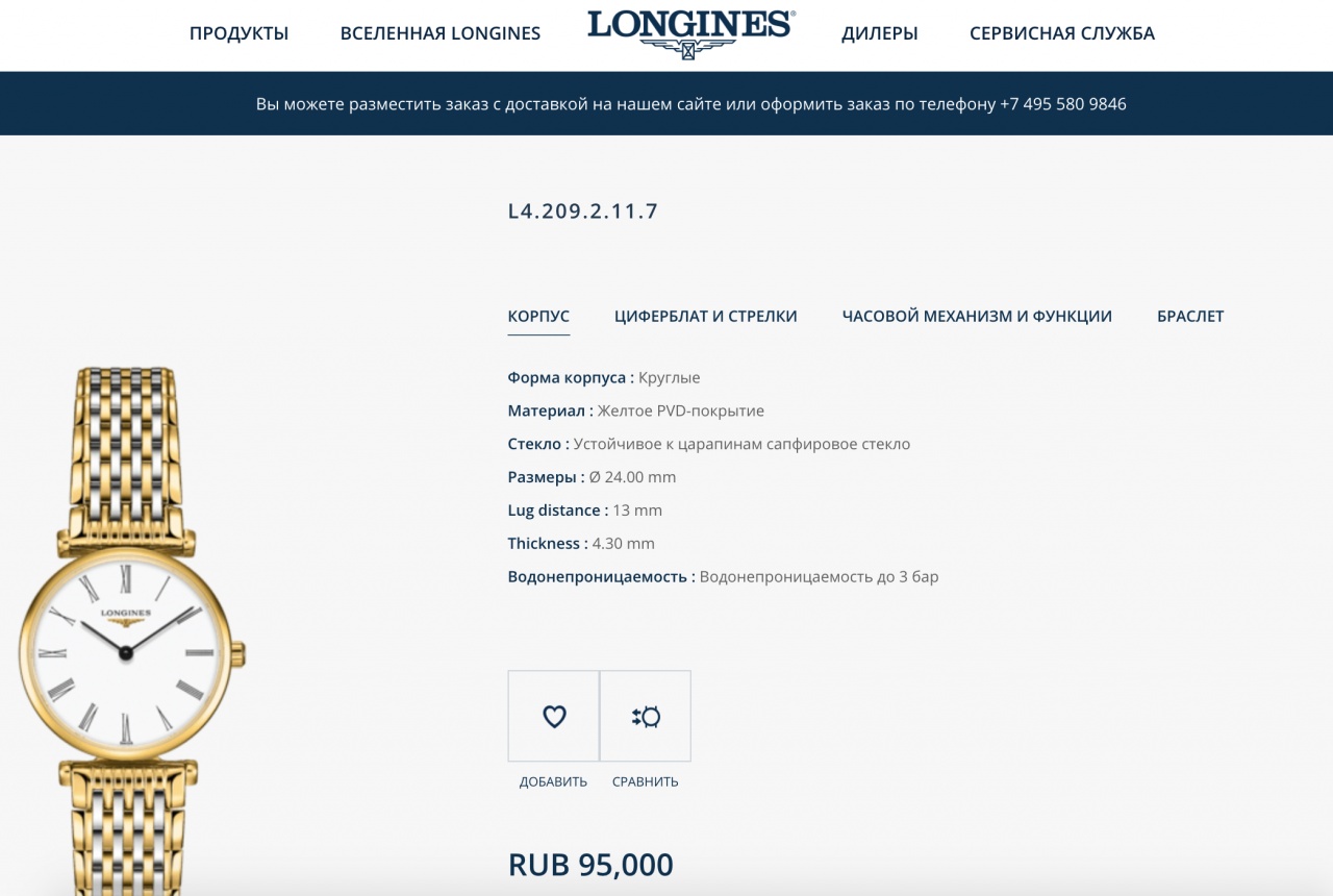 Цена на официальном сайте Longines 95 000 рублей (1000 евро)
