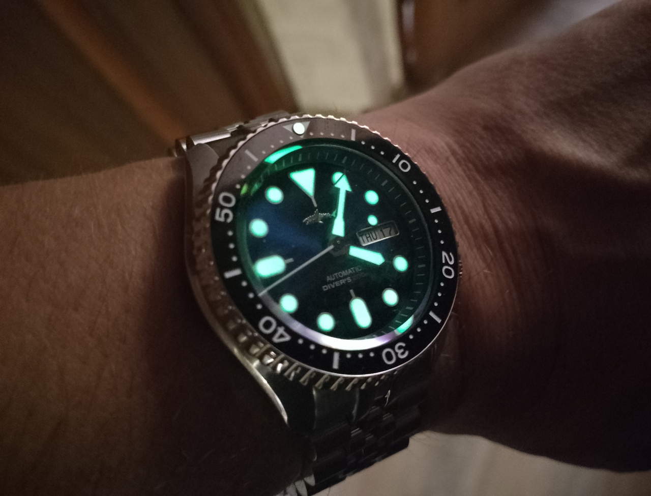 У меня у Монстра от ХеймДаллр люм, тоже хороший, очень хороший, всё нормально видно и равномерно и по стрелкам и по меткам, возможно, бывает и лучше, но к утру спокойно время считывается без вглядывания. На SKX007 от того же ХеймДаллра, вроде, заявлена швейцарская люминова C3, но стрелки более тусклые чем сами метки, но набирает очень быстра от любого засвета, держится до утра, но очень тускло, но время прочитать можно в полной темноте, первый час светит прямо хорошо, потом тускнеет и до утра сохраняет очень тусклое свечение, причём стрелки почти растворяются, можно с трудом их различить на фоне меток, а у Монстра что стрелки, что метки имеют равномерное свечение и более долгое. Самый классный люм, который у меня есть на часах, это на часах BEIHUA от YELANG - огромные метки и стрелки, и светят просто как радиоктивная пыль и до утра и тускнеют медленно и не нужно всматриваться утром, чтобы прочитать , всё видно сразу, видать реальная люминова использовалась. На Монстрах у меня тоже один из самых лучших светонакопителей среди моих часов. Это одна из причин, по которой я вторые ХеймДаллр-ы заказал, думал, что у них с люмом всегда все в порядке. Но тут, как и у всех - лотерея.