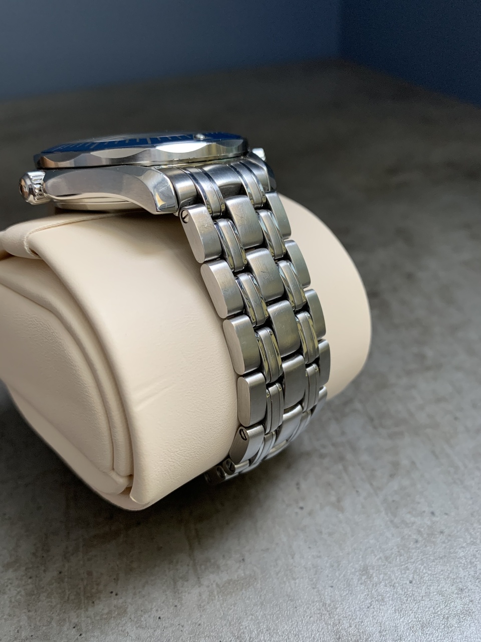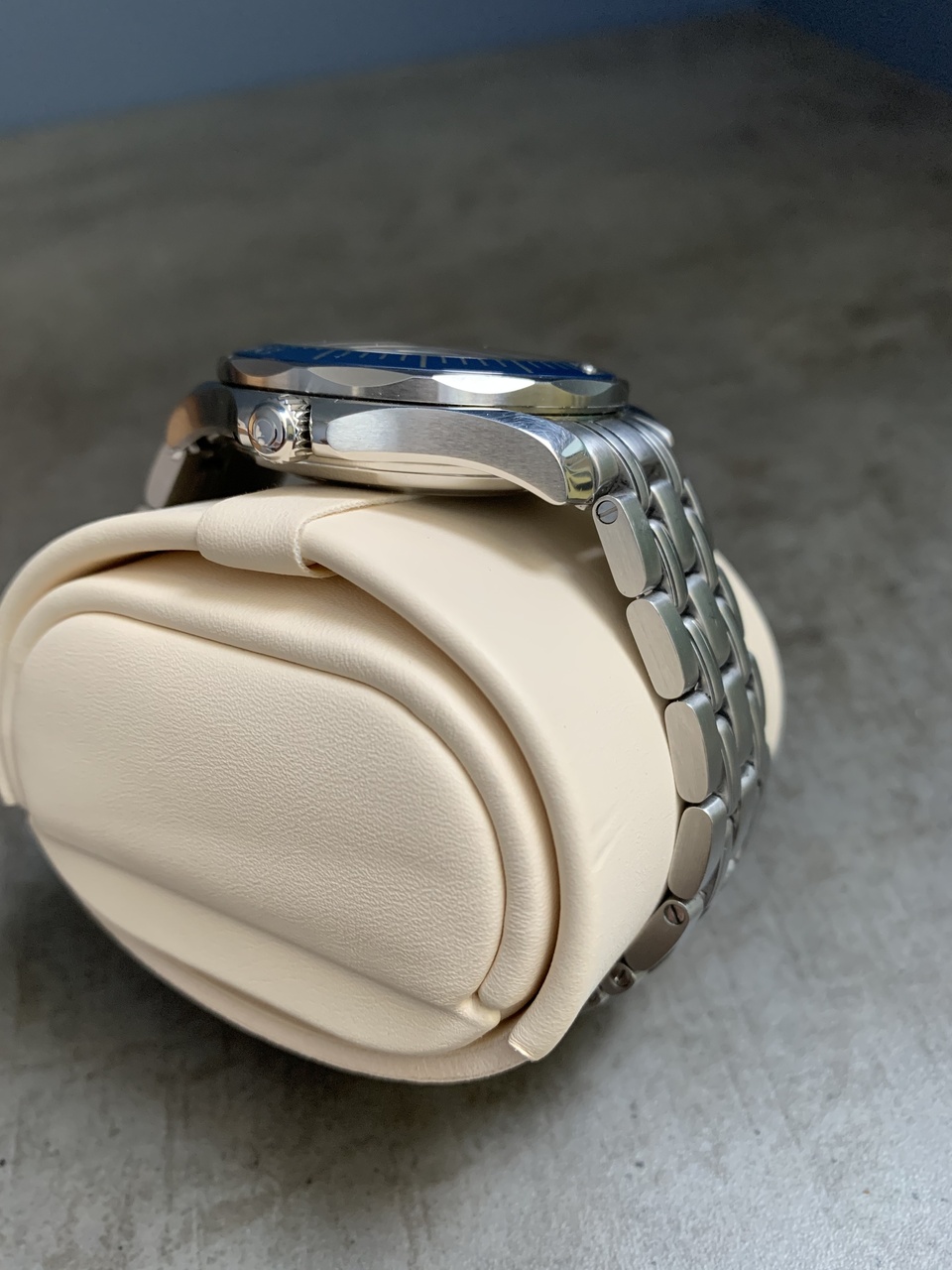 Полный комплект: часы, картонная коробка, деревянная коробка, документы, инструкция, холдер, мешочек, бирка, пленка с задней крышки, снятые звенья.