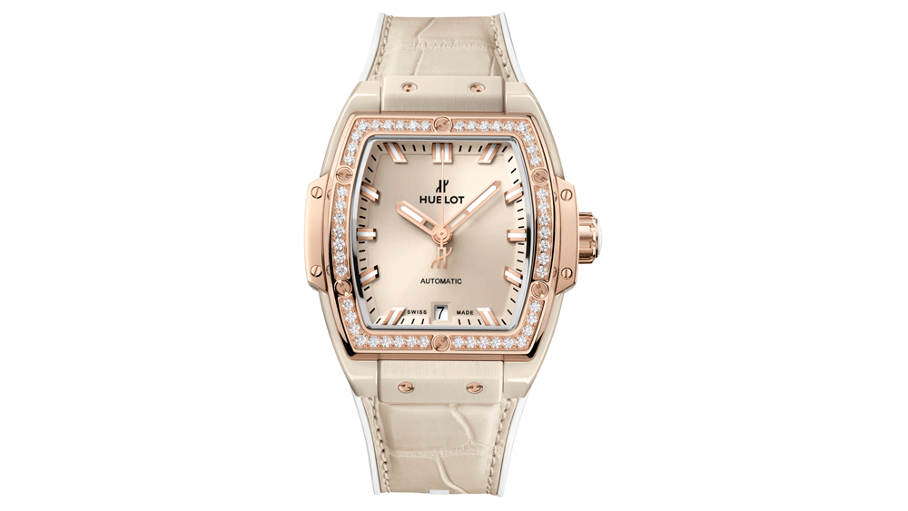 По следам за пастельно-розовым и голубым оттенками, Hublot представила новую модель Big Bang в бежевом цвете и доказала, что нейтральные оттенки никоим образом не скучны. Новые часы имеют корпус из сатинированной бежевой керамики размером 39 мм на 12,6 мм и соответствующий циферблат песочного цвета с солнечными лучами. Ремешок из кожи аллигатора выполнен в таком же цвете и оснащен раскрывающийся изящной баклей. Безель, доступный в полированном титане или 18-каратном «королевском золоте» (новый золотой цвет Hublot, в основном содержащий платину, которая на оттенок теплее, чем 18-каратное золото 5N), украшен не менее чем 50 бриллиантами и добавляет нотки роскоши в монохромный дизайн. Модель King Gold стоит 24 100 US, а титановая версия обойдется в 19 900 US.