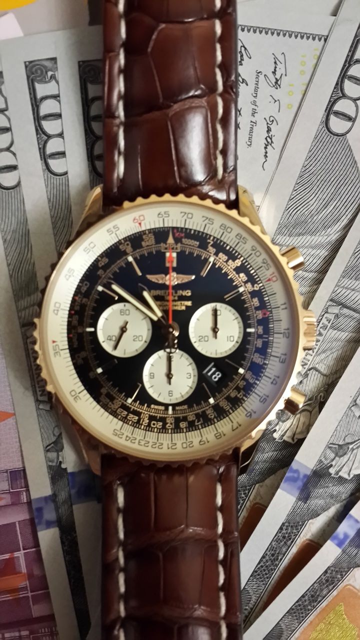 Продам золотые часы BREITLING NAVITIMER 01 46мм. Покупались за 1 597 770.Есть всемирная гарантия.На гарантии. Материал корпуса золото 750 пробы. Золотая защежка 750 пробы.Мануфактурный механизм.Сертифицированный хронометр C.O.S.C. Запас хода 72 часа.Сапфировое стекло с двойным антибликовым покрытием.Водозащита 30м.Размер корпуса 46 мм.Ремешок - кожа аллигатора.Лимитированная версия,всего 200 штук выпущено,эти 28.Состояние идеальное.Носил очень мало и аккуратно.Все документы и чеки есть. В подарок новый черный ремешок из аллигатора.