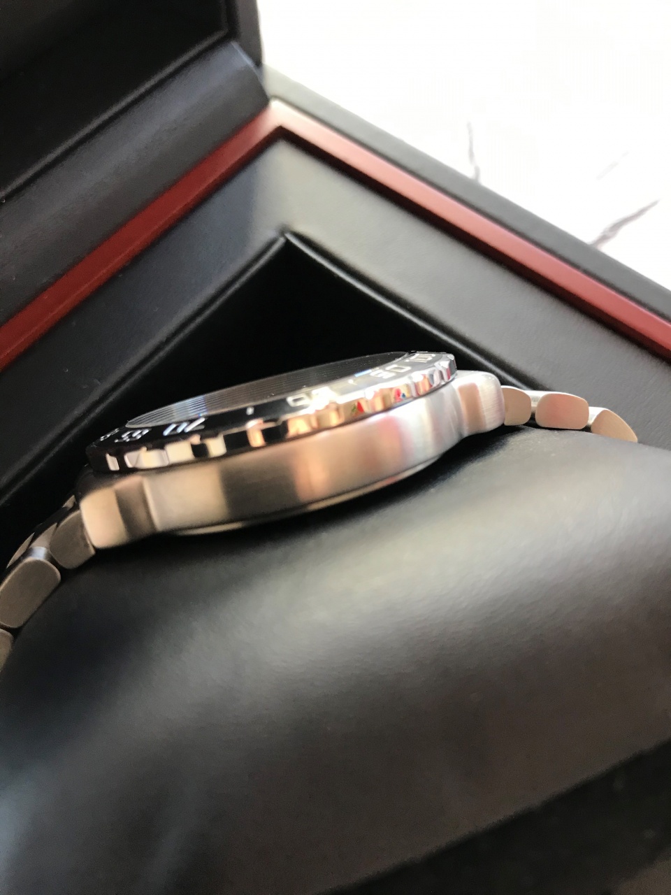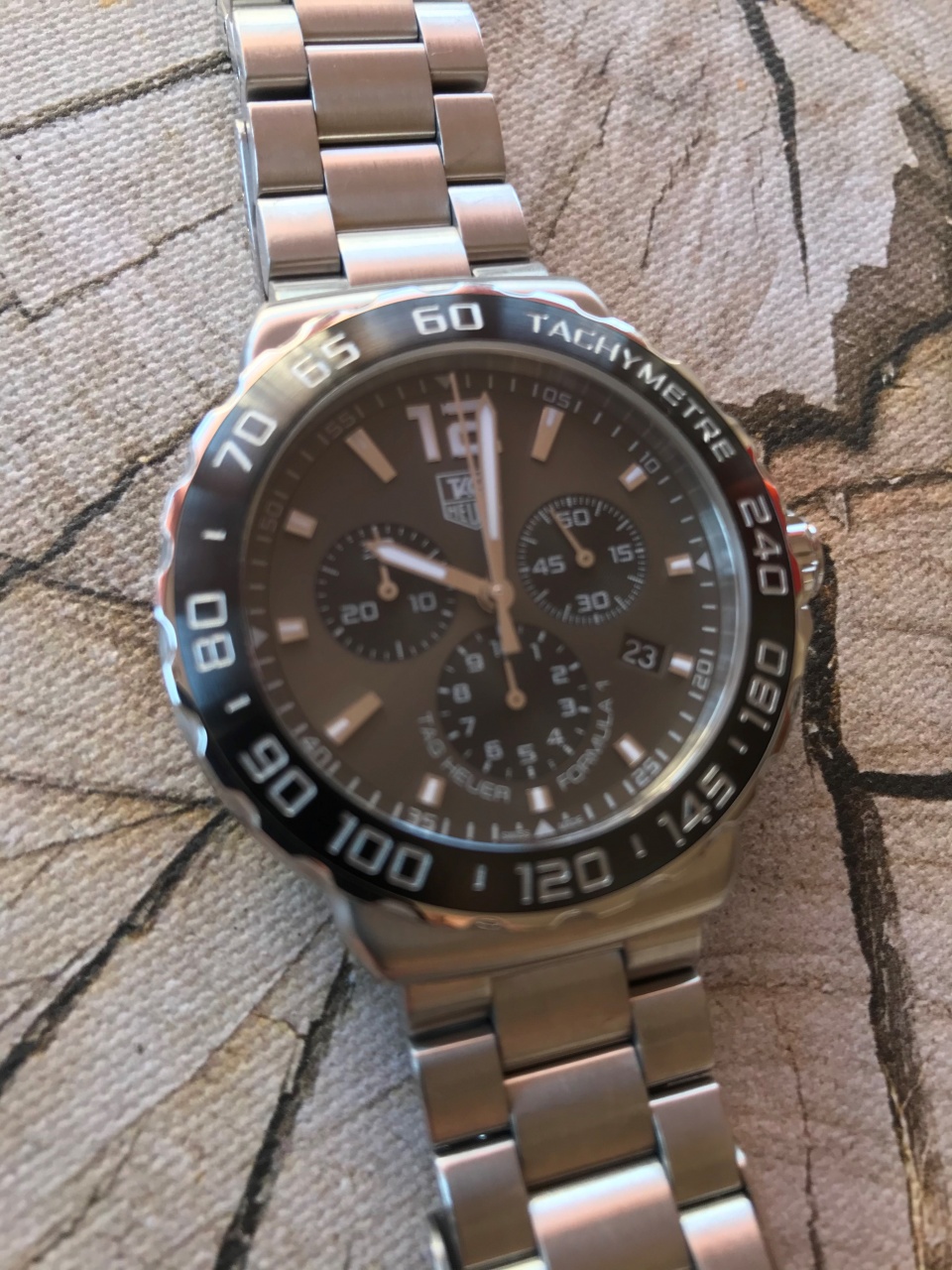 - Прошедший пескоструйную обработку неподвижный безель из полированной стали и матовой керамики с выгравированной серебряной тахиметрической шкалой