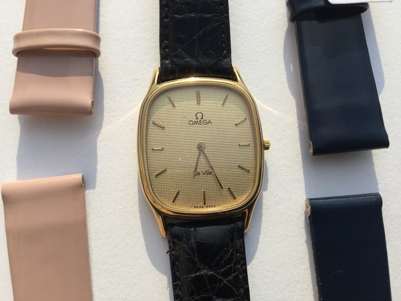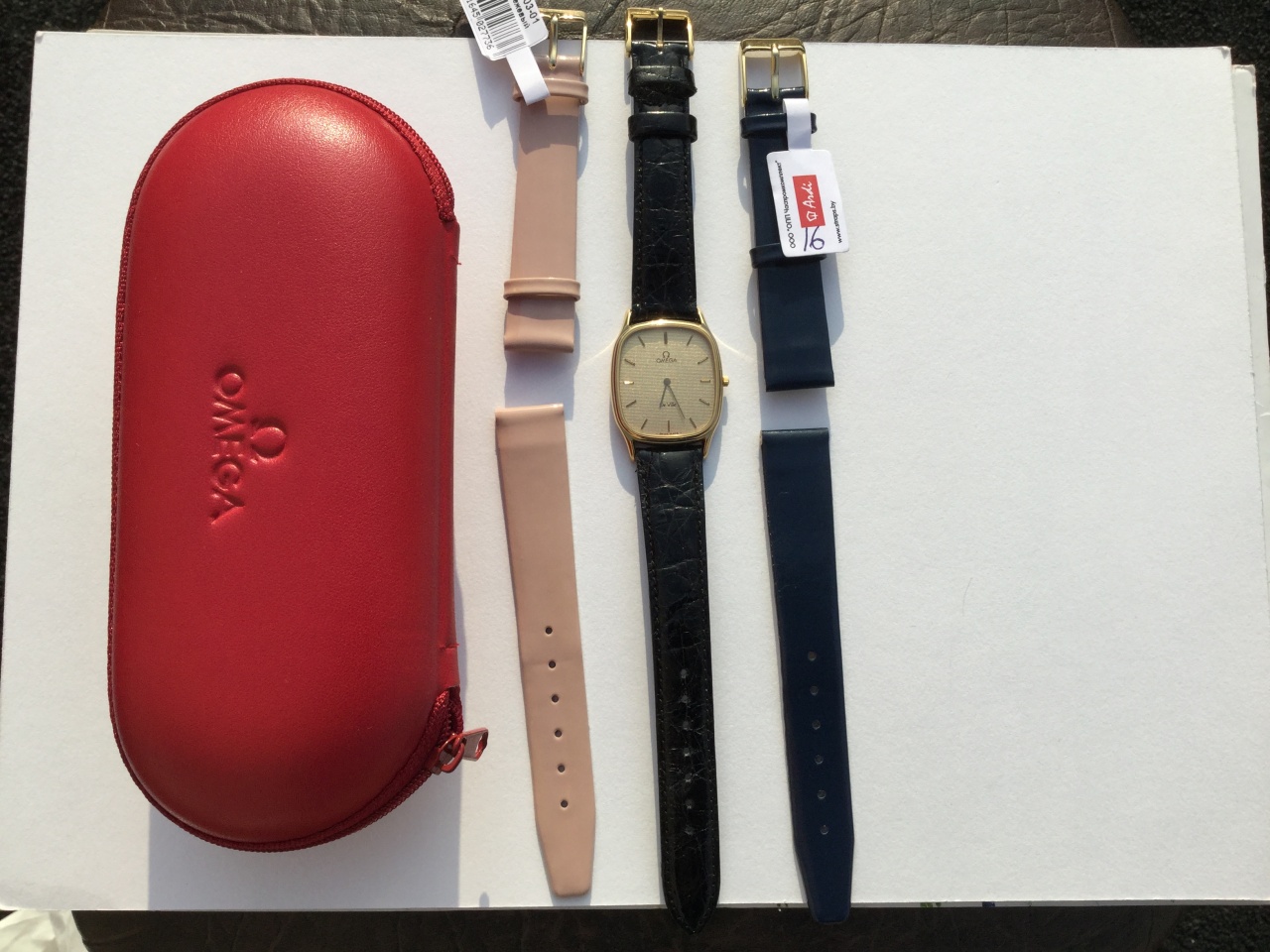Omega De Ville женские , гильешированный циферблат , накладные метки, позолоченные , механизм квацевый 6 камней 1377 , отличное состояние , размеры видны на фото , новая батарейка , дополнительно пенал для путешествий и 2 кожанных ремешка . Пока торг .