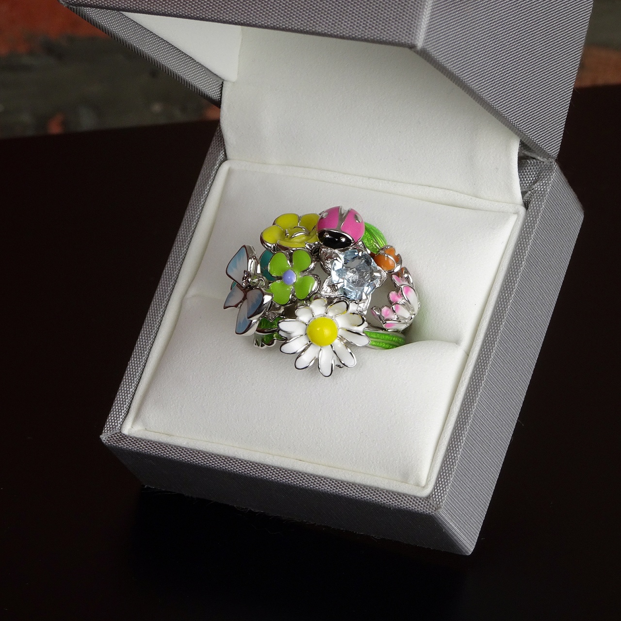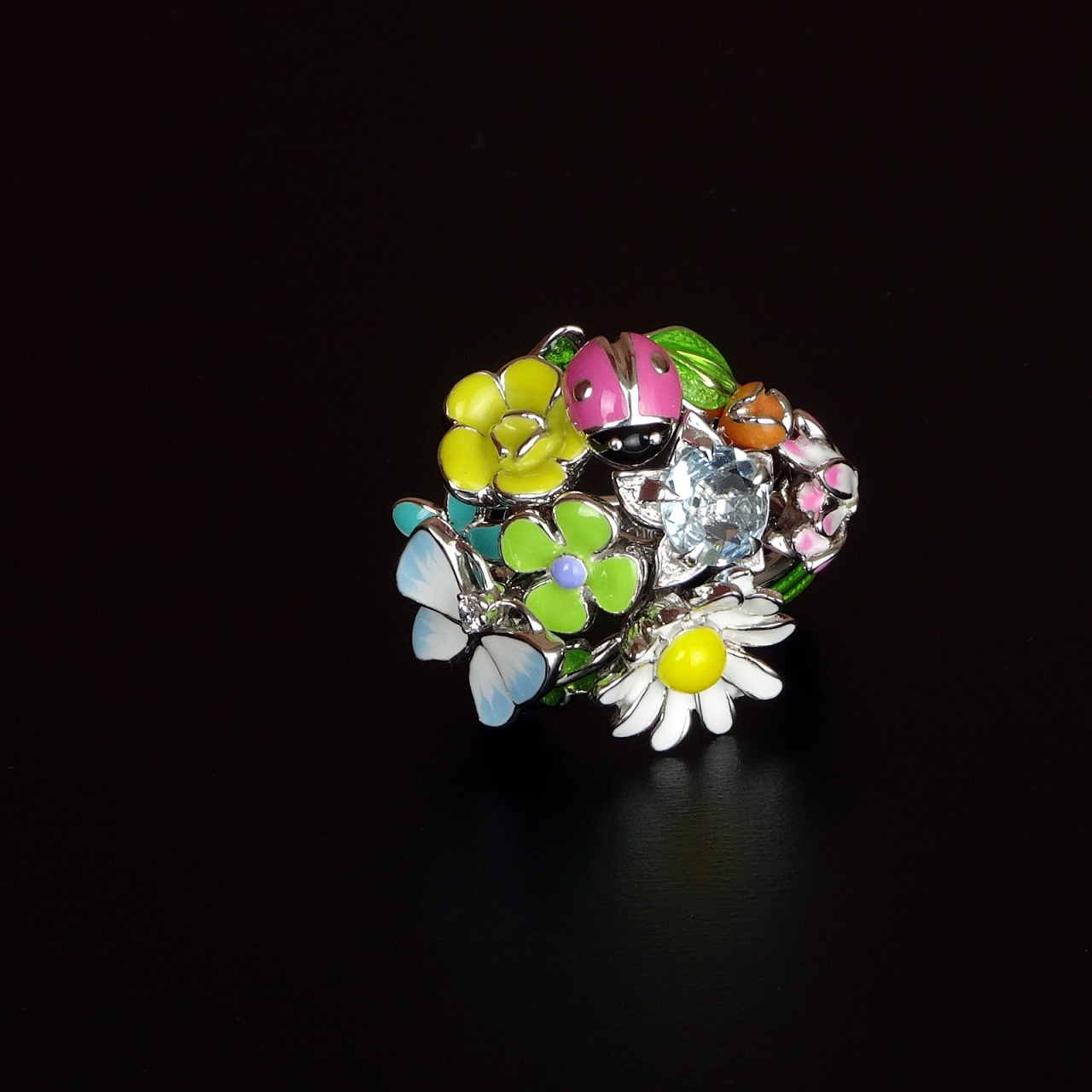 Белое золото, ручная эмаль, драгоценные камни - бриллиант, аквамарин.