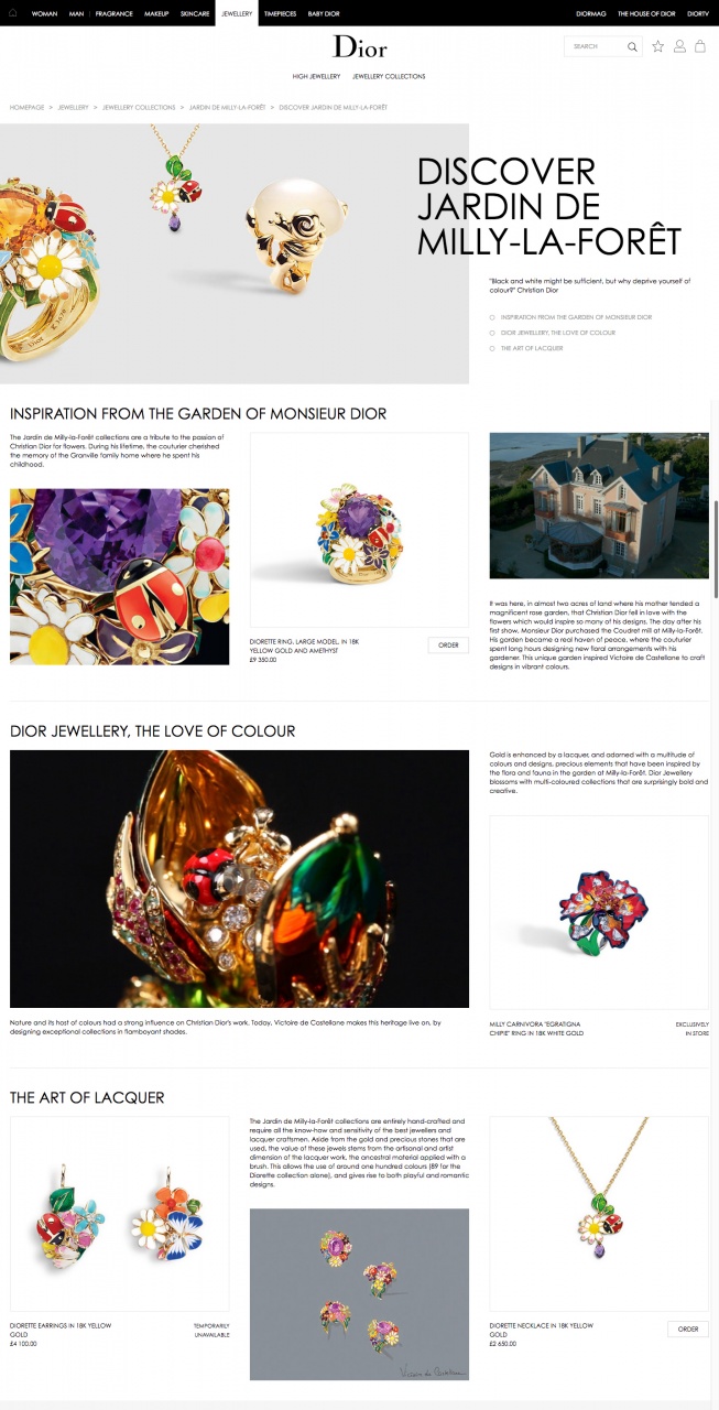"Создание коллекций Jardin de Milly-la-Forêt полностью выполняется вручную, и требует виртуозного мастерства лучших ювелиров и лакировщиков. Украшения из золота и драгоценных камней уникальны благодаря старинному искусству лакирования кистью, опыту и художественному вкусу создающих рисунки специалистов. К примеру, лакировочная техника использует около сотни цветов (89 для одной только коллекции Diorette) и помогает создавать столь насыщенные яркими красками роскошные и одновременно поэтичные изделия."