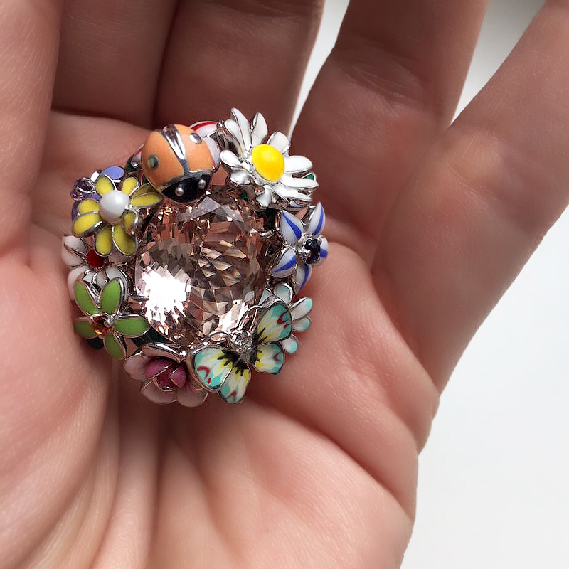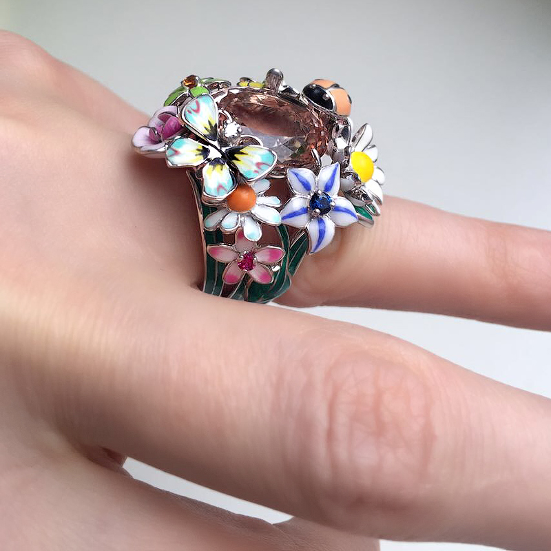 Белое золото, ручная эмаль, драгоценные камни - бриллианты, цветные сапфиры. Центральный камень - морганит. Одно из самых крупных и дорогих колец этой коллекции.