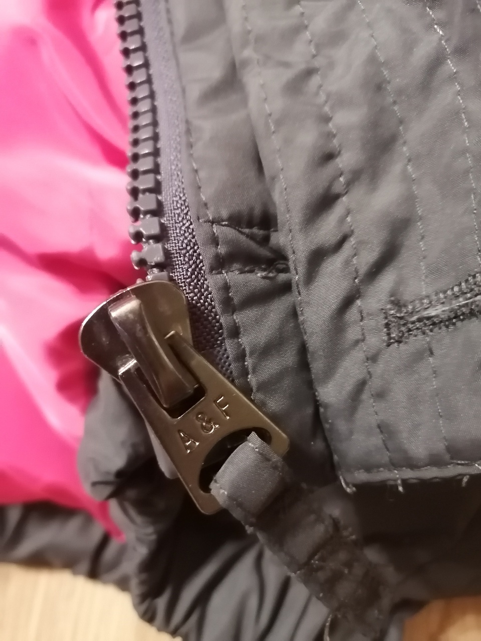▪️Серый мужской стёганый пуховик (куртка) Аберкромби & Фитч с капюшоном и трикотажным воротником-стойкой на ярко-малиновой подкладке