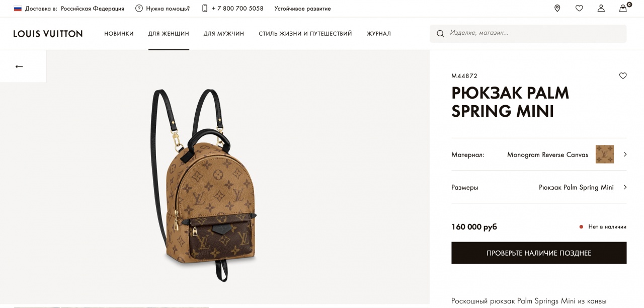 Стоимость в Louis Vuitton: 160.000 руб. но это ничего не значит, его нет в наличии. Это как цена на стальную Дайтону Rolex - в каталоге есть, но купить нельзя..