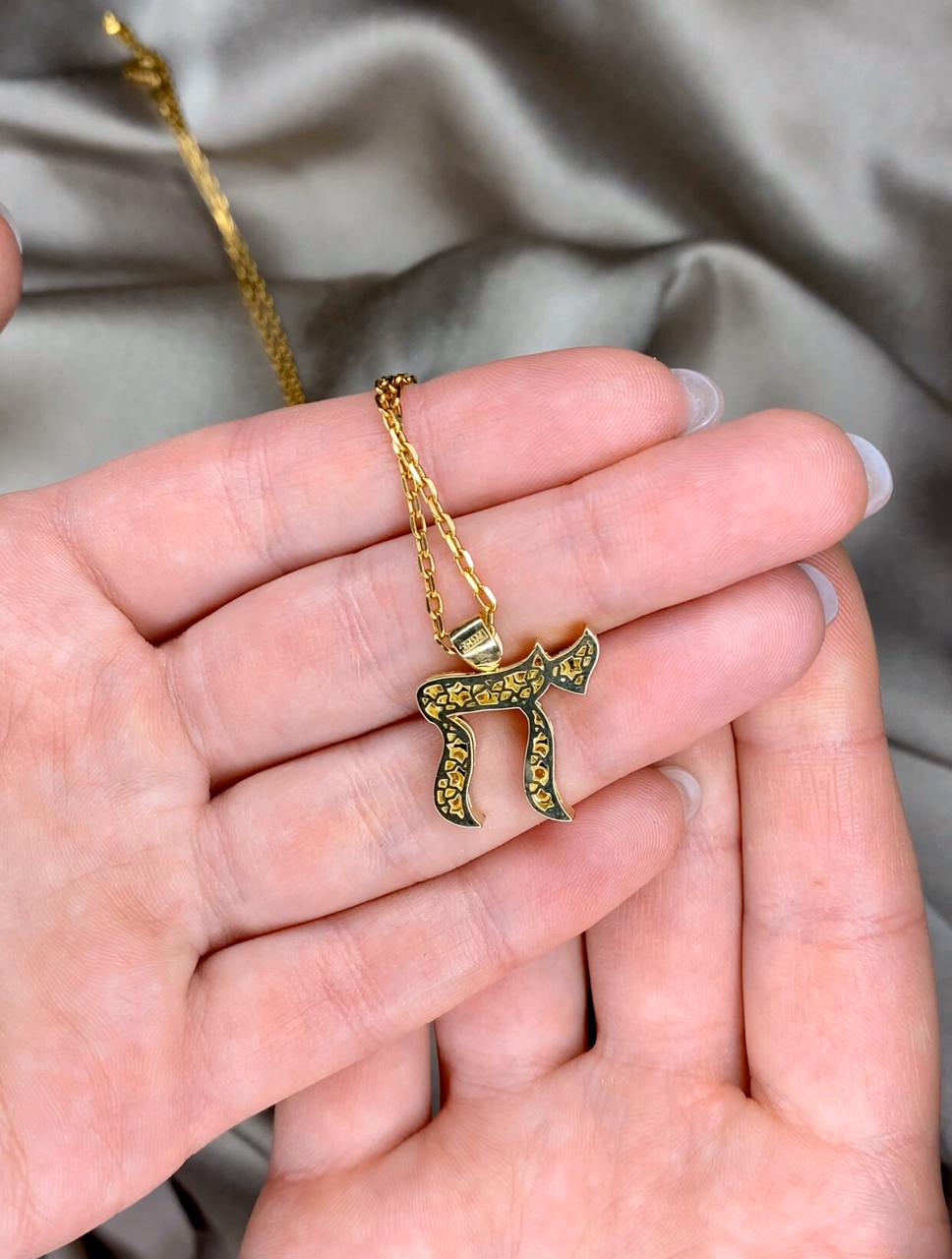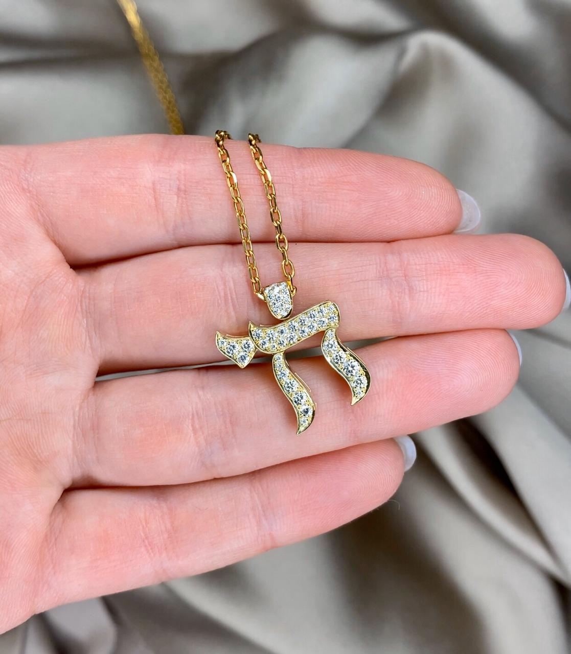 Кулон-бестселлер Bazel Judaica из желтого золота с россыпью бриллиантов HAIM. Этот символ на иврите означает “Жизнь” и не несет религиозно-сакрального смысла. Он вместе с традиционным еврейским тостом “ле хайм” выражает уважение к человеческой жизни.