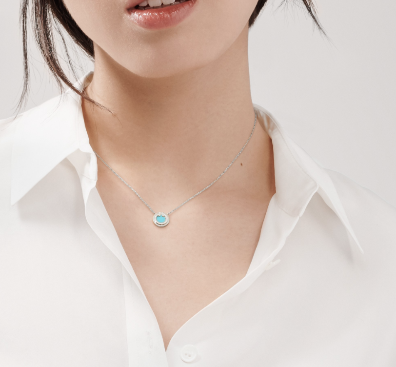Отличительная черта этой подвески, украшенной сияющими бриллиантами, — бирюза, один из первых камней,